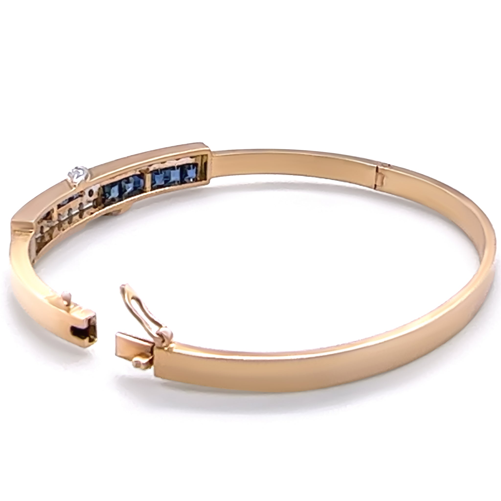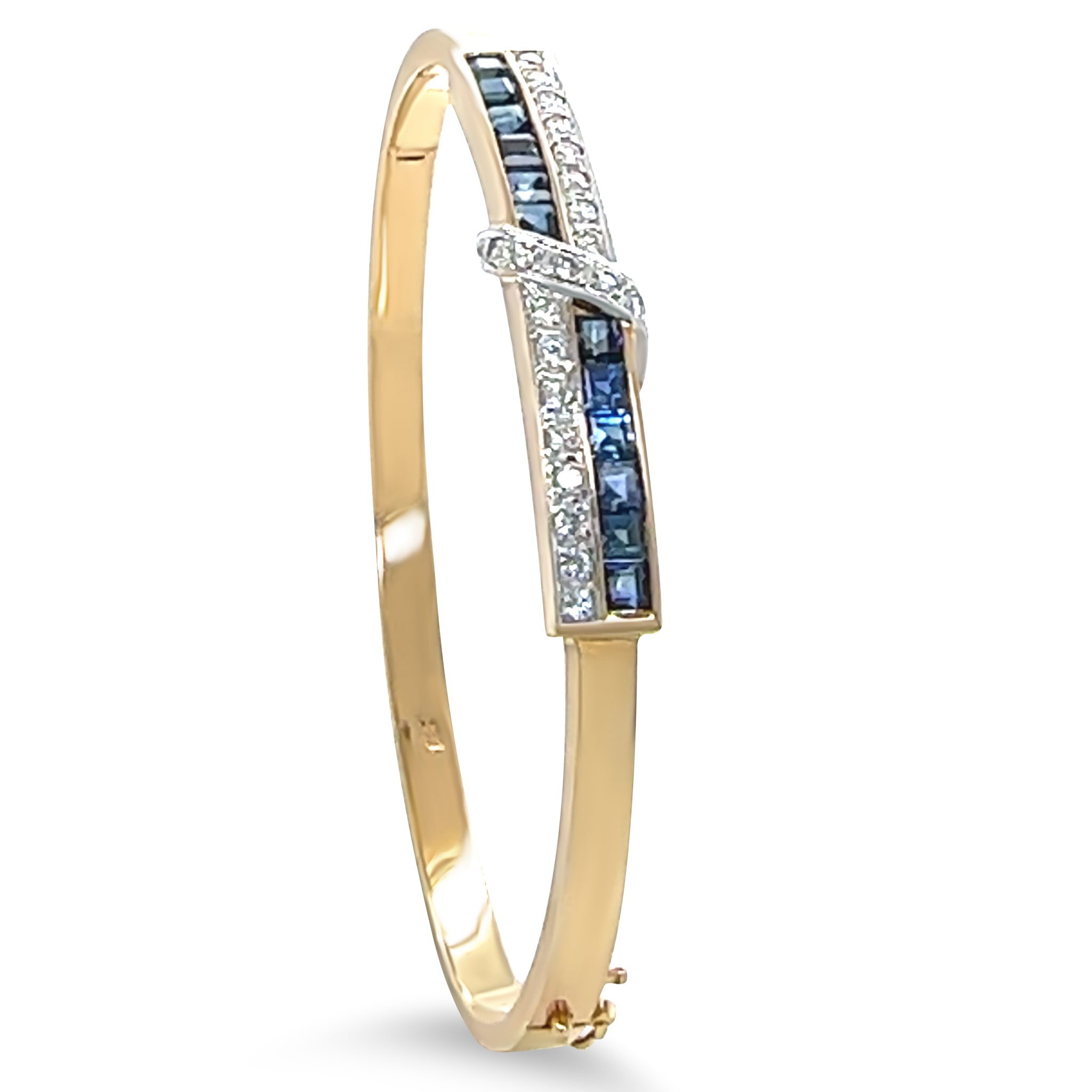 This elegant hinged bangle bracelet is crafted in 14ct yellow and white gold and hand-made to showcase superior craftsmanship. The bracelet features vivid blue square-cut natural sapphires, channel-set to highlight their colour, complemented by round brilliant-cut diamonds (G/VS, total weight 0.38ct) that are delicately bead-set.