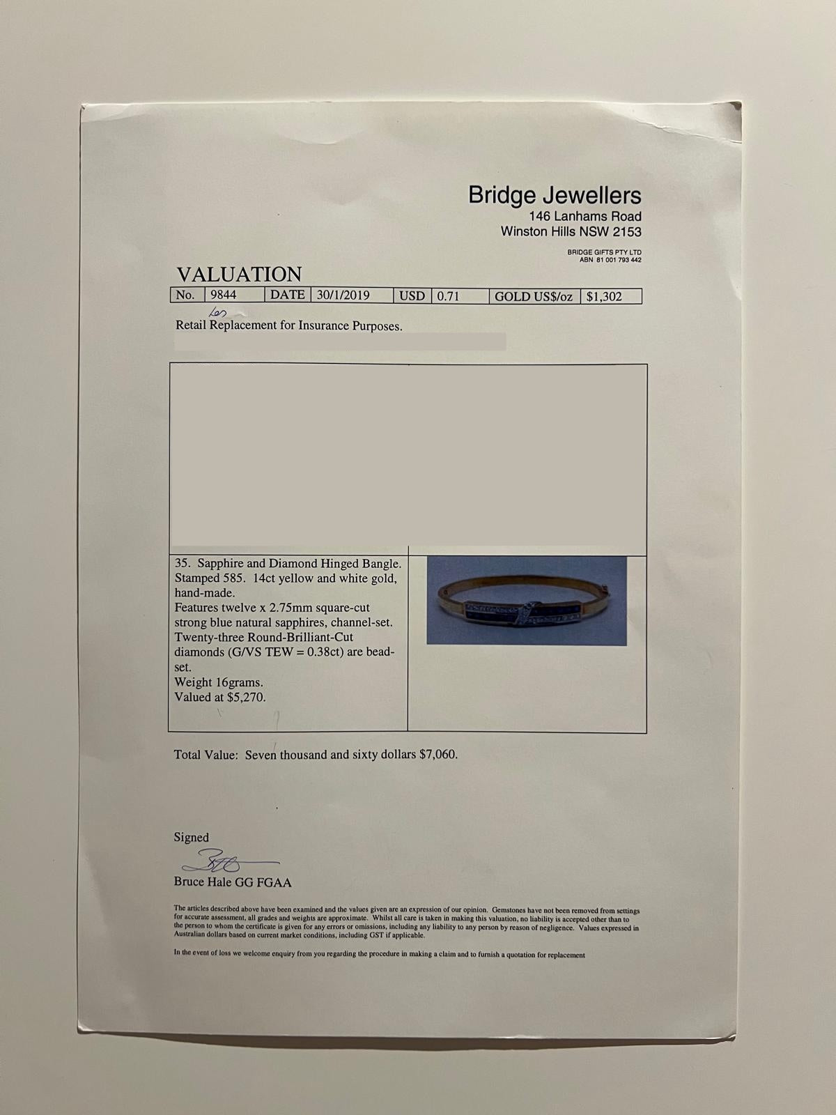 Accompanied by: This Bespoke Diamond & Sapphire Bracelet is accompanied by Bridge Jewellers Valuation (#9844) dated 30/01/2019.