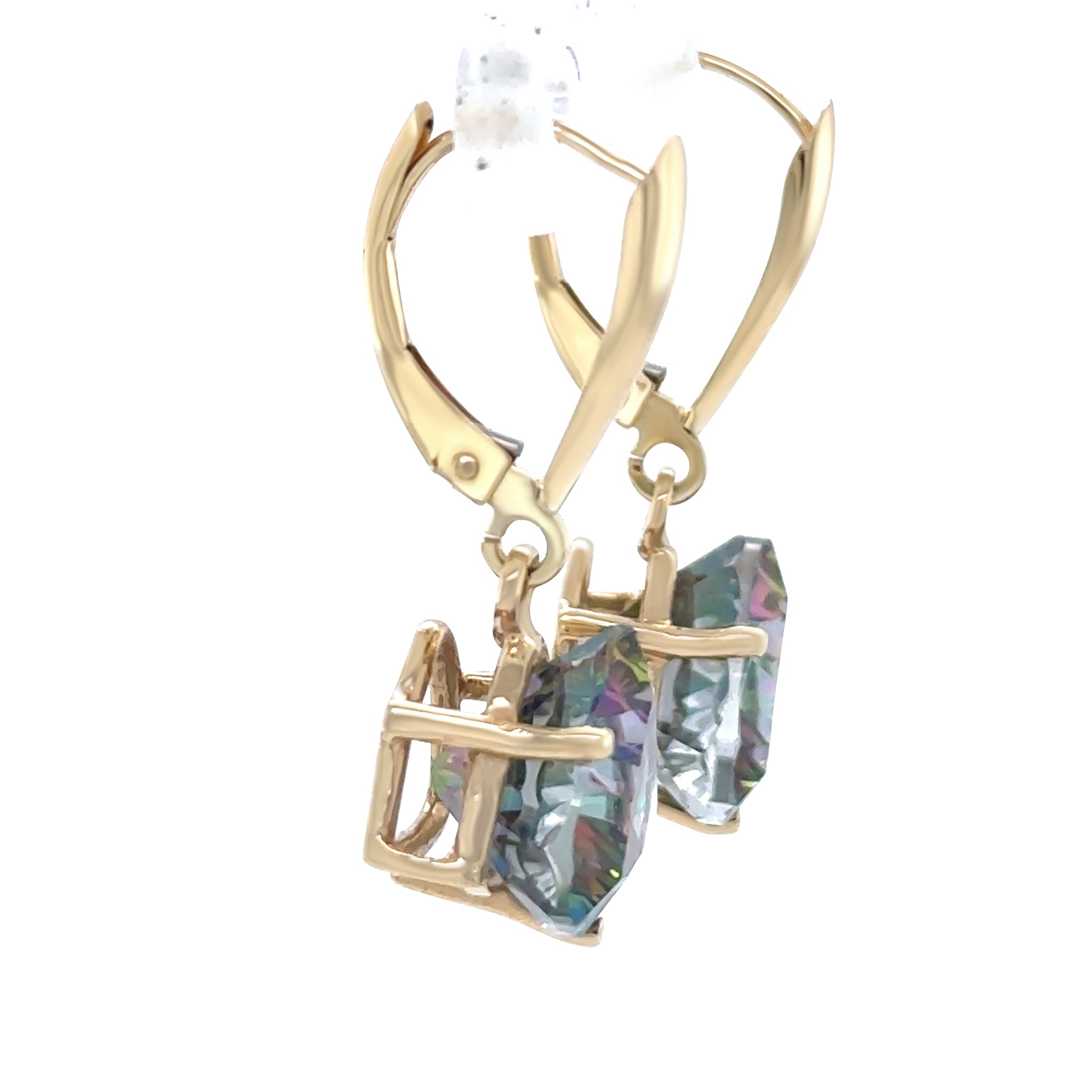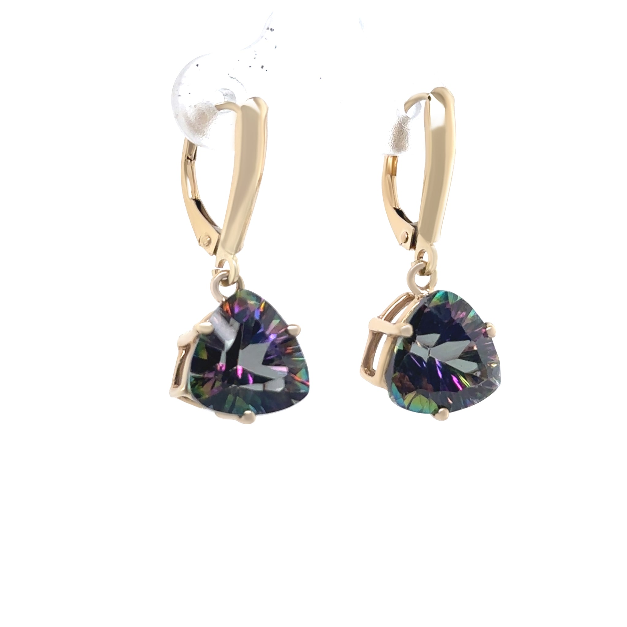 These elegant mystic topaz drop earrings are crafted in 14ct yellow gold with a cast and machined design. Each earring features a 10mm trilliant-cut treated mystic topaz (total weight 4.45ct) set in a three-claw wire setting, suspended from a continental clip for graceful movement and eye-catching sparkle.