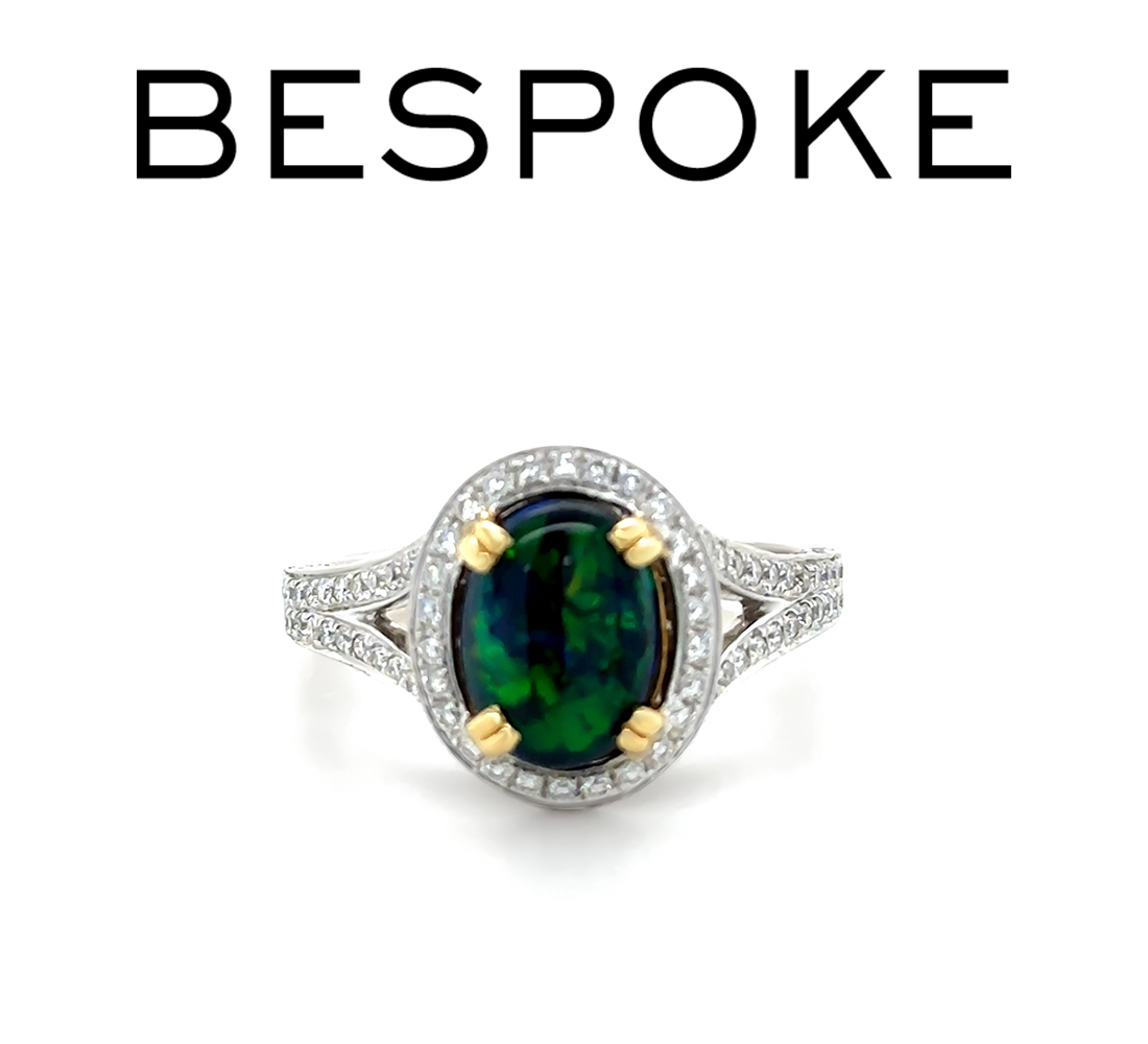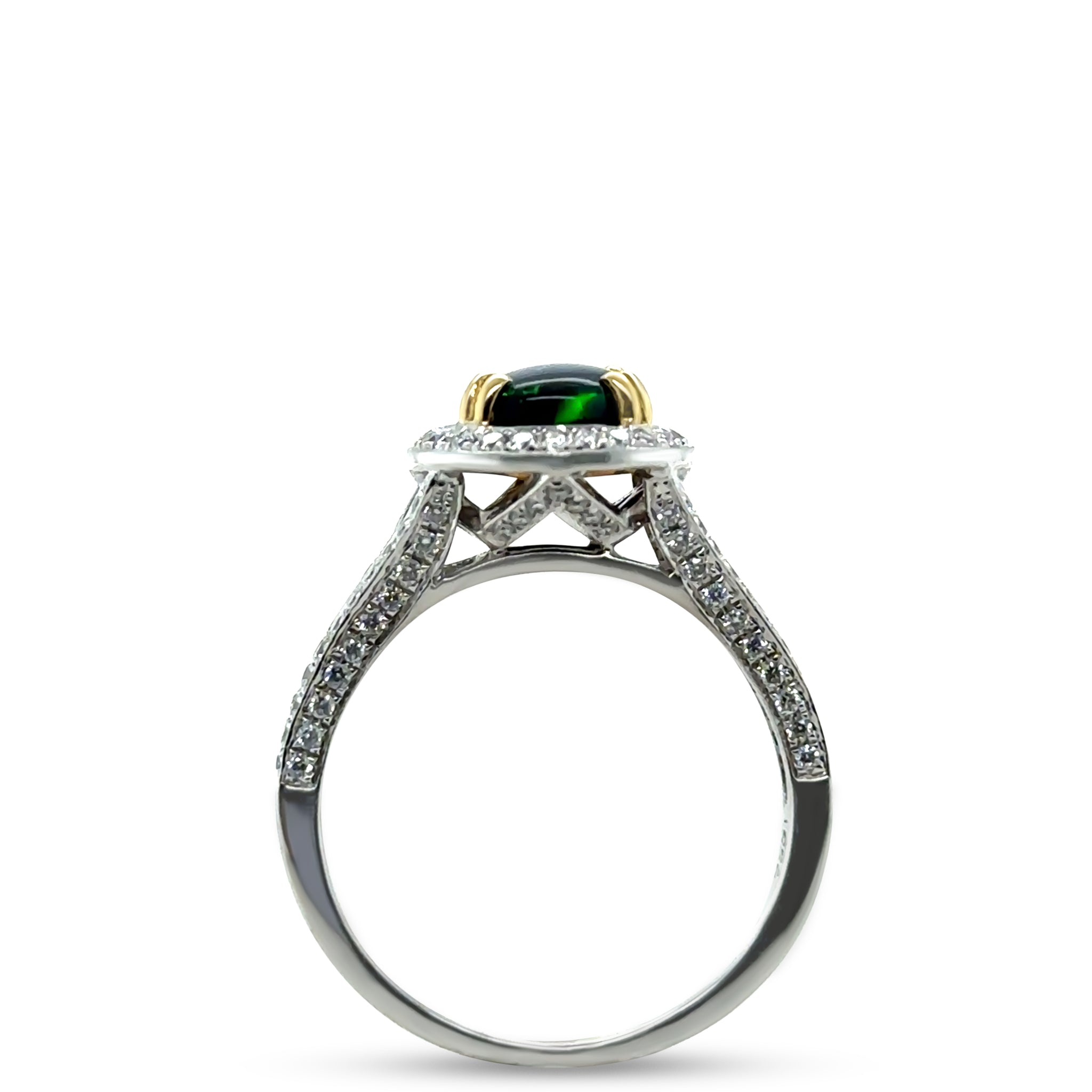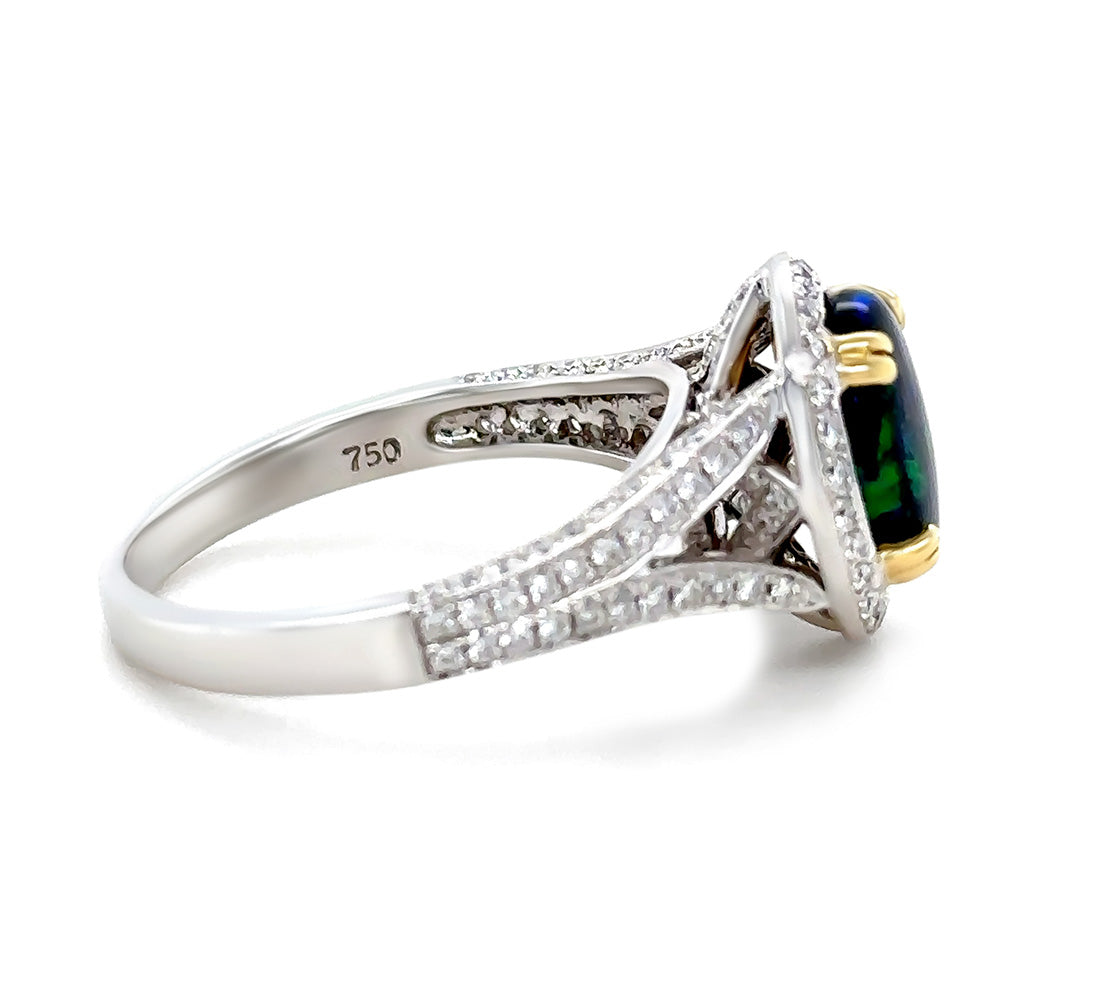This striking black opal ring features a deep green and blue Lightning Ridge black opal (10mm x 7mm x 4.4mm, 2.9ct) set in 18ct white gold with yellow gold claws securing the opal. The centre stone is accentuated by 0.67ct of round brilliant-cut diamonds set along the split shank, creating a harmonious blend of vibrant colour and sparkling brilliance.