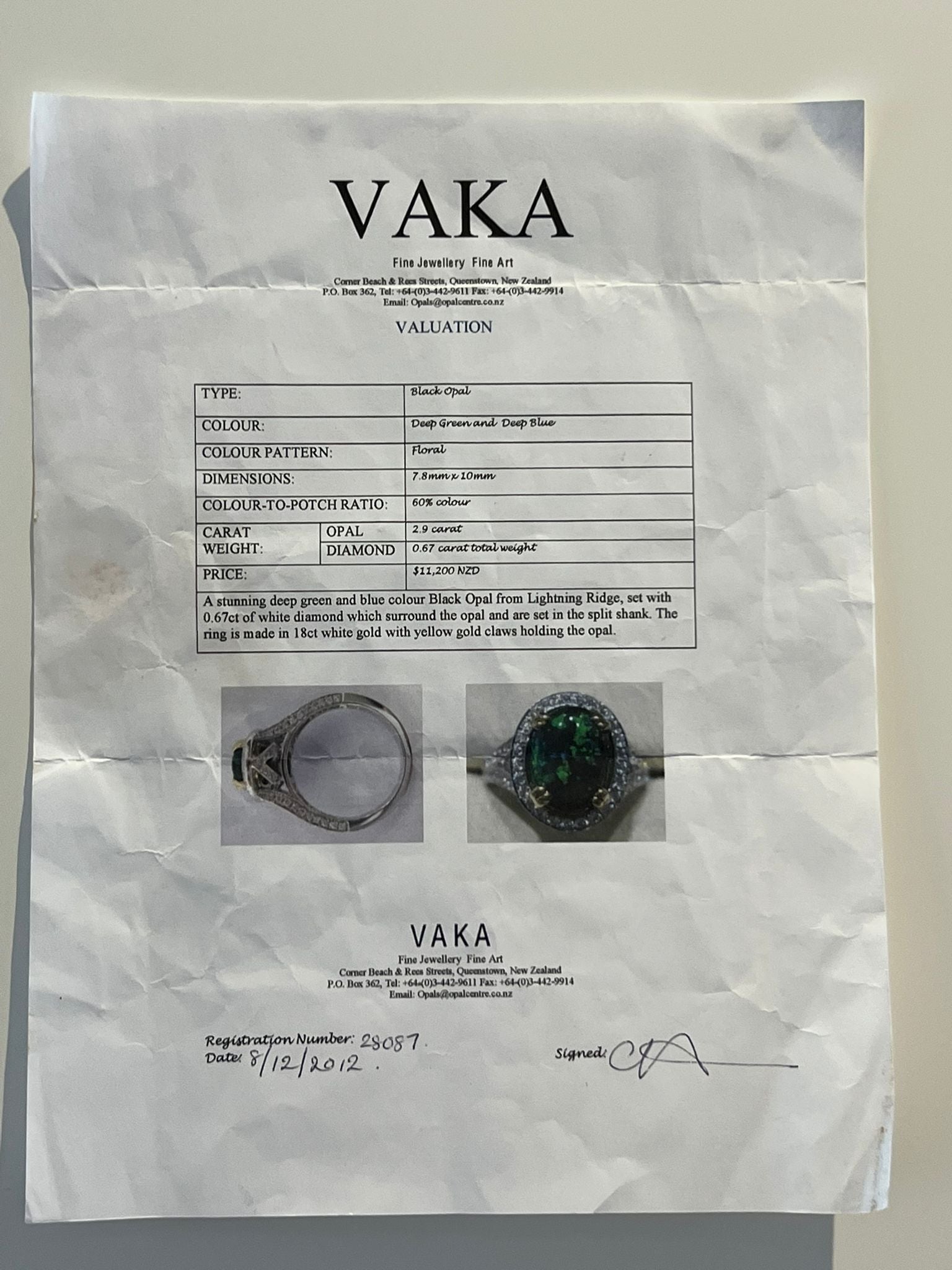 Accompanied by: This Black Opal & Diamond Ring is accompanied by Vaka Valuation (#28087 dated 8/12/2012).