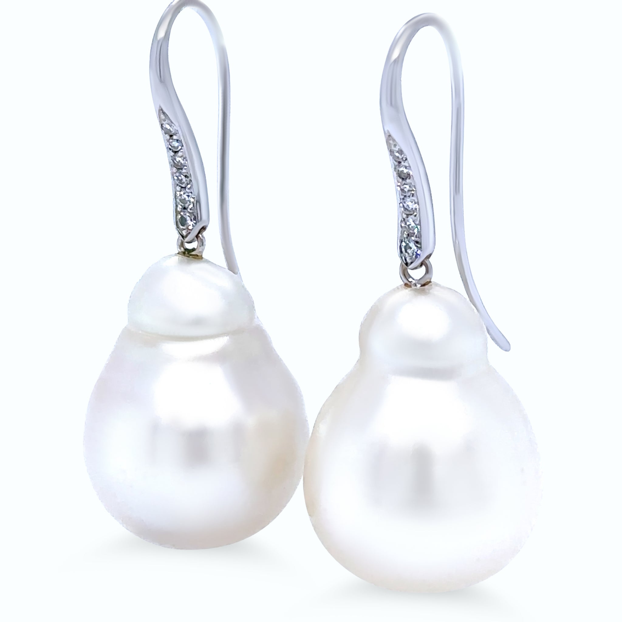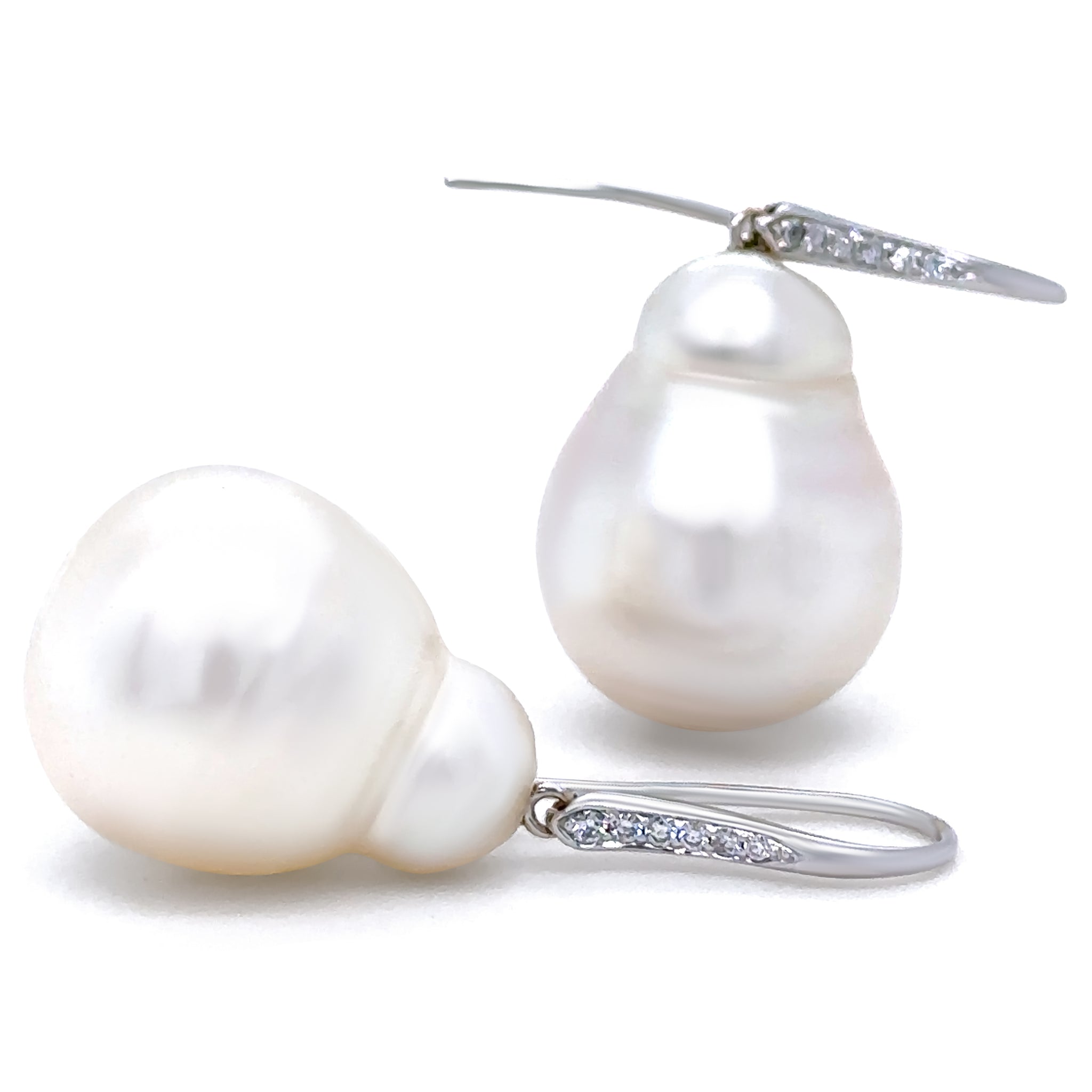 A pair of elegant drop earrings, each showcasing a 15mm baroque South Sea cultured pearl with lustrous natural beauty. The pearls are complemented by five round brilliant-cut diamonds bead-set in 18ct white gold, adding subtle sparkle and refinement to the design.