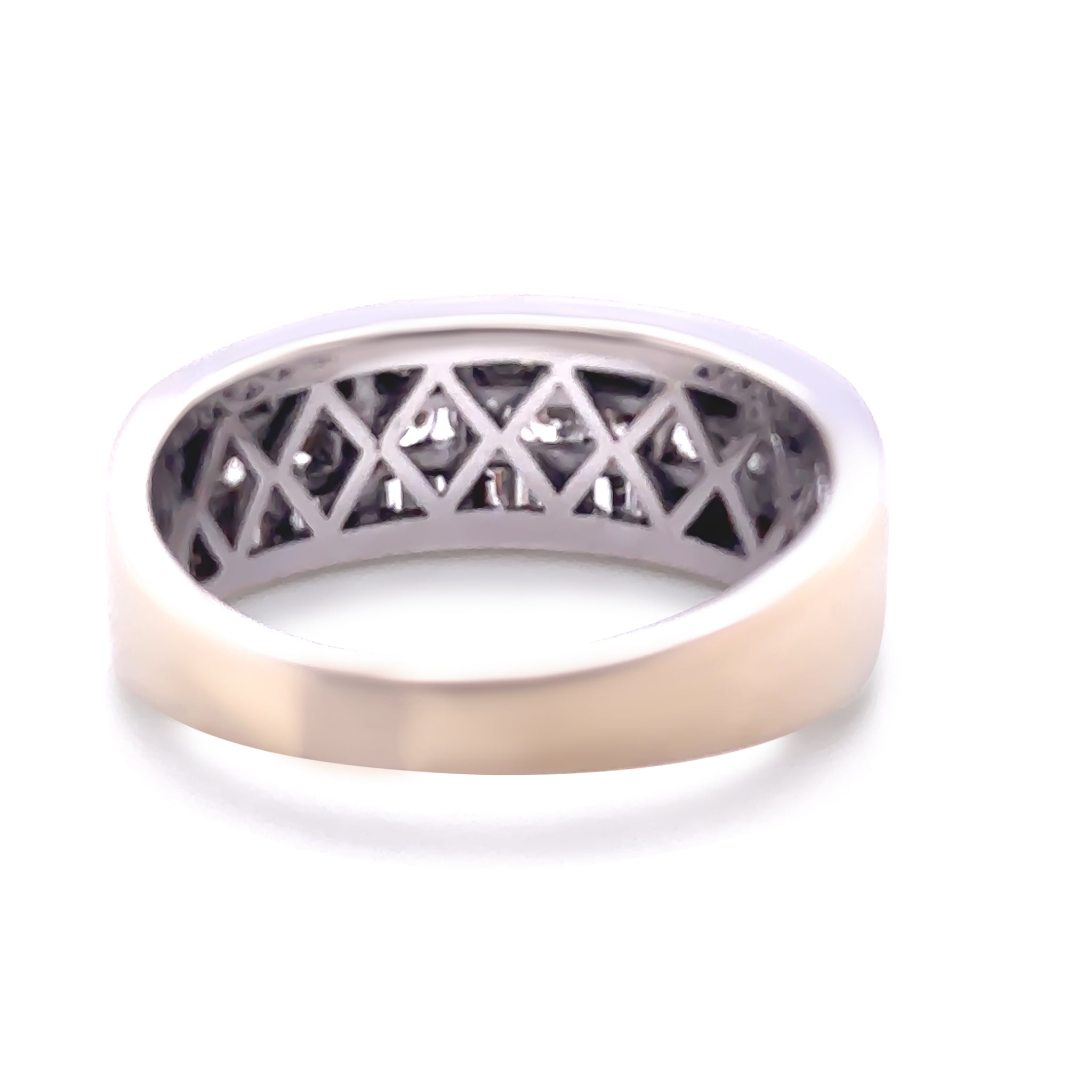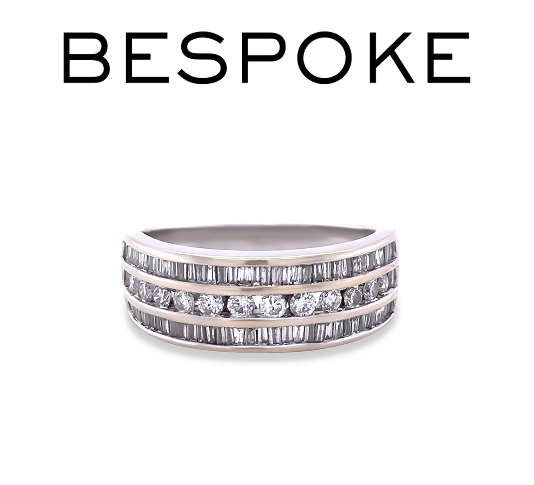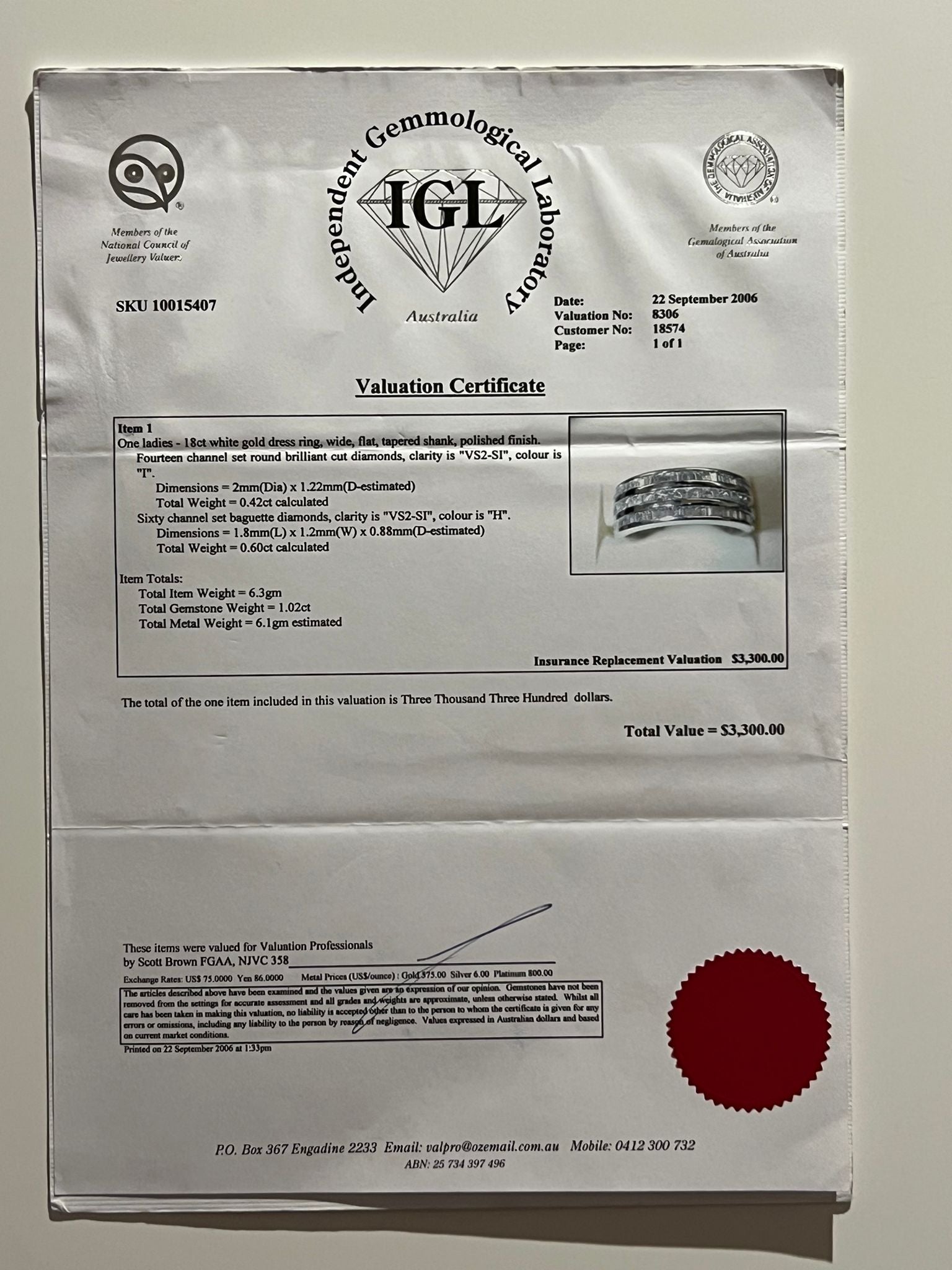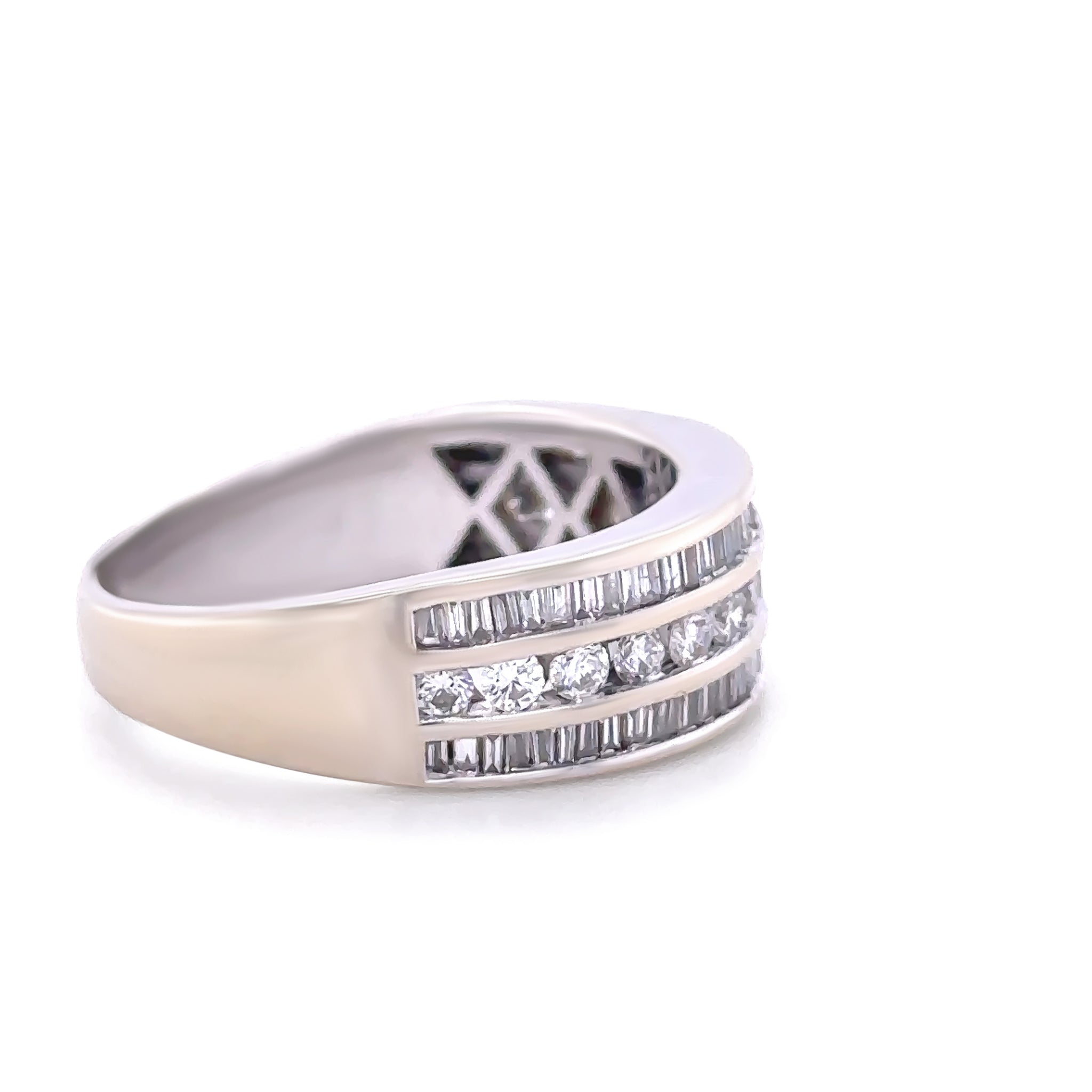 The design features fourteen round brilliant-cut diamonds (VS2–SI clarity) channel-set, totaling 0.42ct, complemented by sixty baguette-cut diamonds (H colour, VS2–SI clarity) channel-set along the shoulders, totaling 0.60ct, for a combined gemstone weight of 1.02ct.