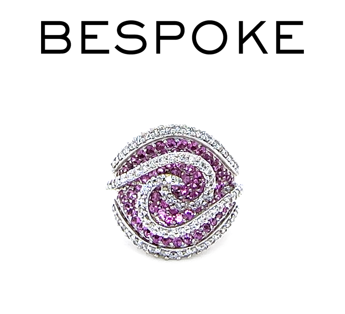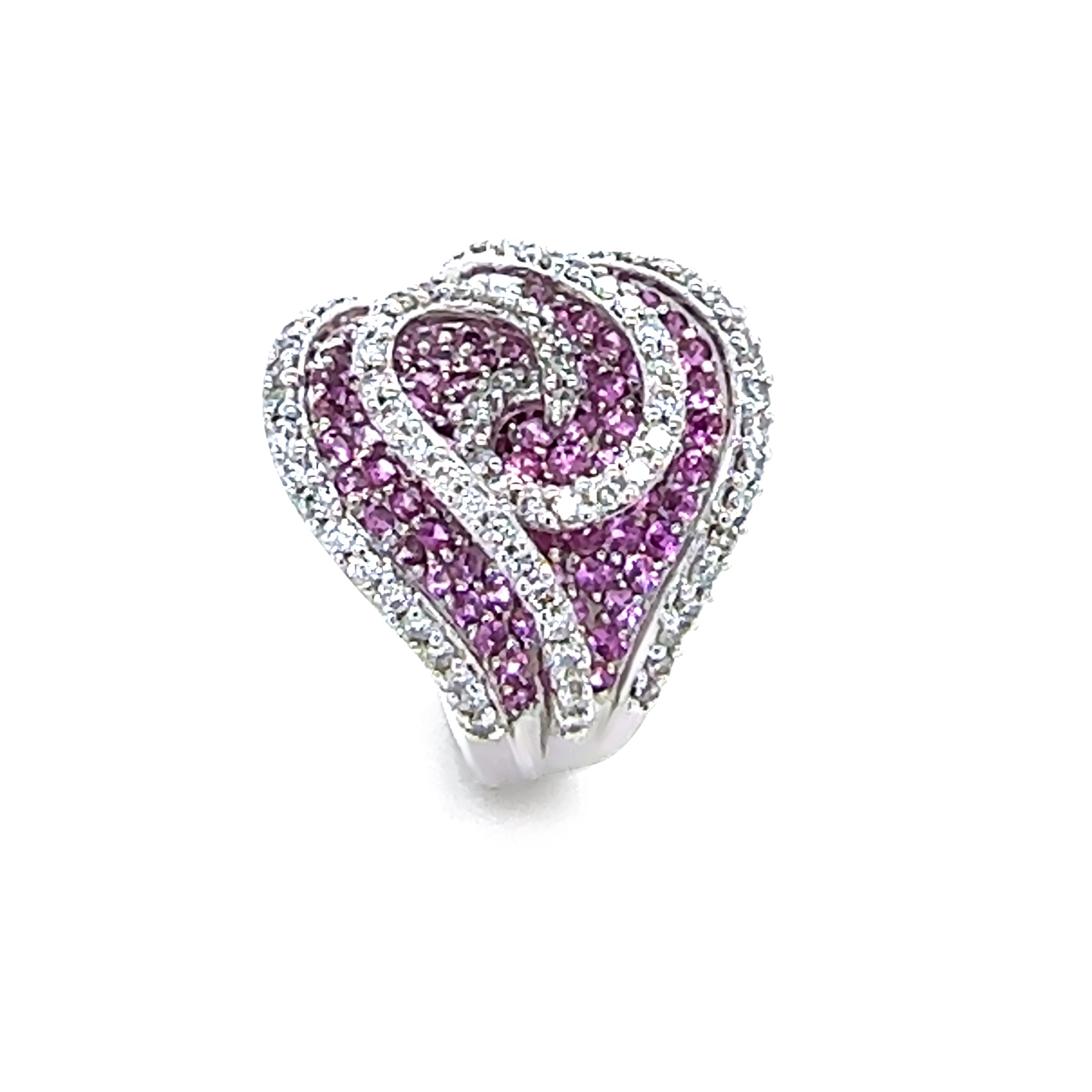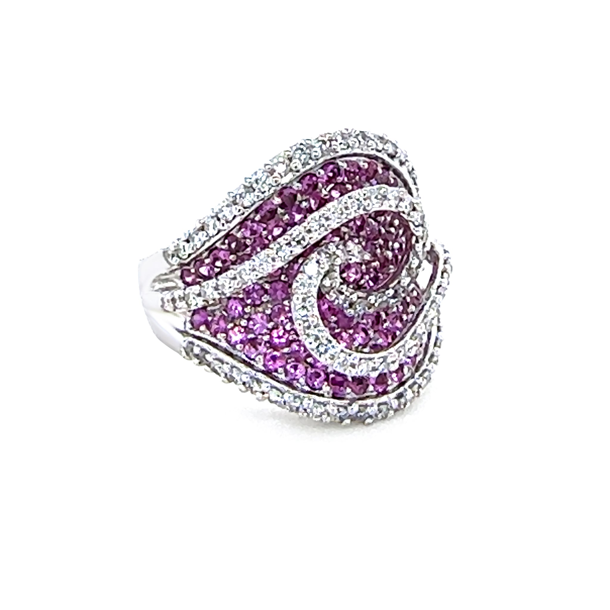 This exquisite dress ring is crafted in 18ct white gold, cast and hand-assembled to showcase superior craftsmanship. The ring features vivid pink round-cut natural sapphires (total weight 2.52ct) bead-set across the top, complemented by round brilliant-cut diamonds (H/SI, total weight 1.22ct) for added sparkle.