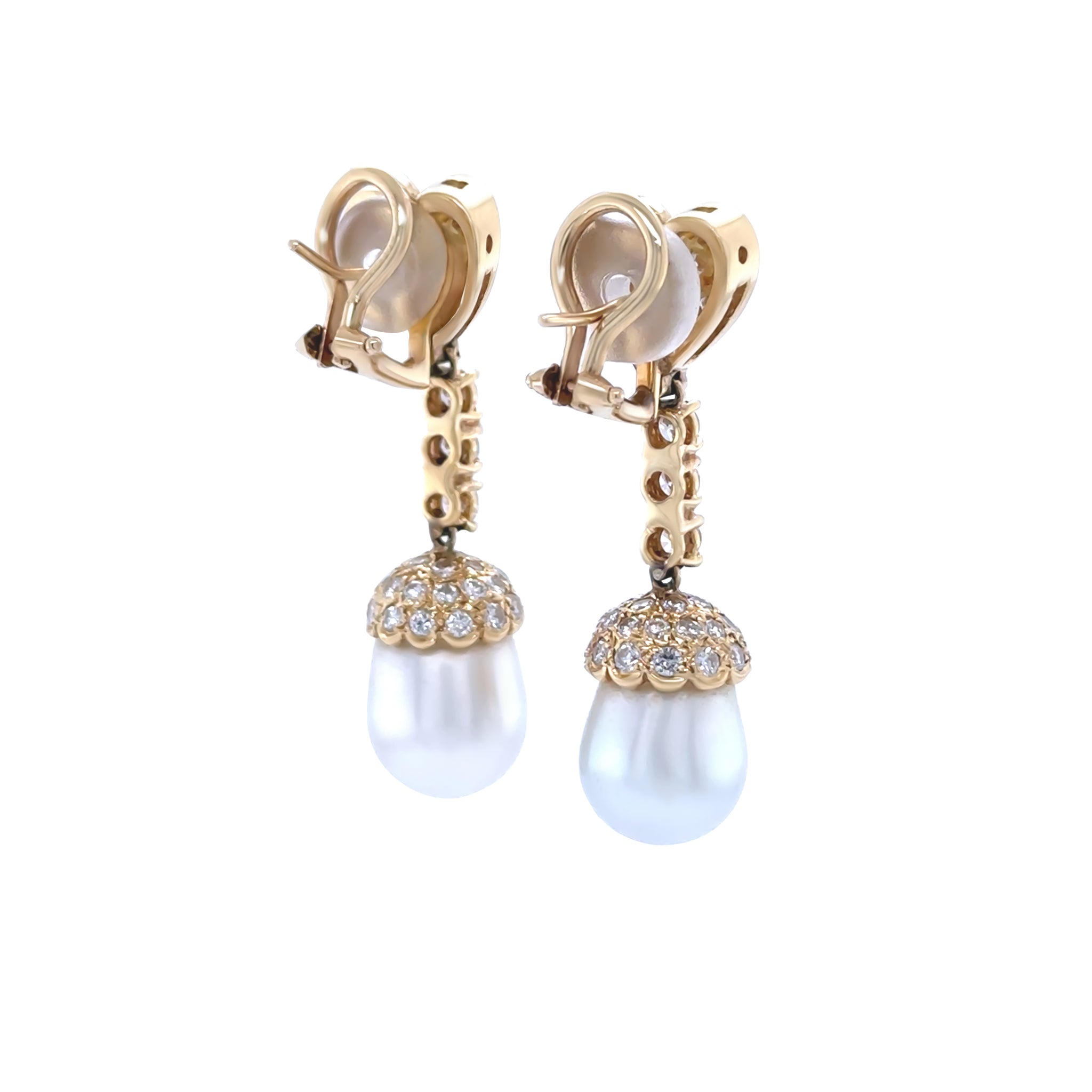 A pair of 18ct yellow gold drop earrings. Each earring is post set with a bell-shaped South Sea cultured pearl, measuring approximately 9.8mm wide x 11.3mm long. The pearls display an excellent lustre, clean skin, and a silver-white colour. Above the pearls, scalloped-edged caps are pavé set with 60 round brilliant cut diamonds (30 in each, approx. 0.015ct each), while the heart-shaped tops are pavé set with 20 round brilliant cut diamonds (10 in each, approx. 0.02ct each).
