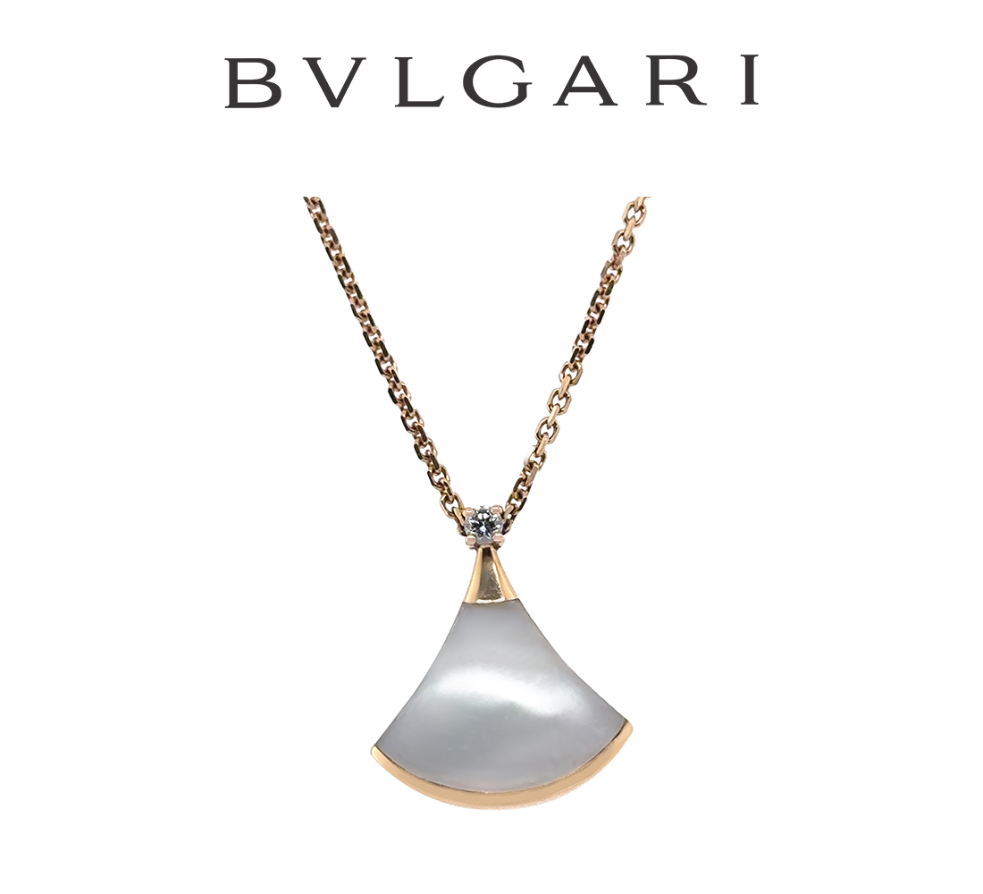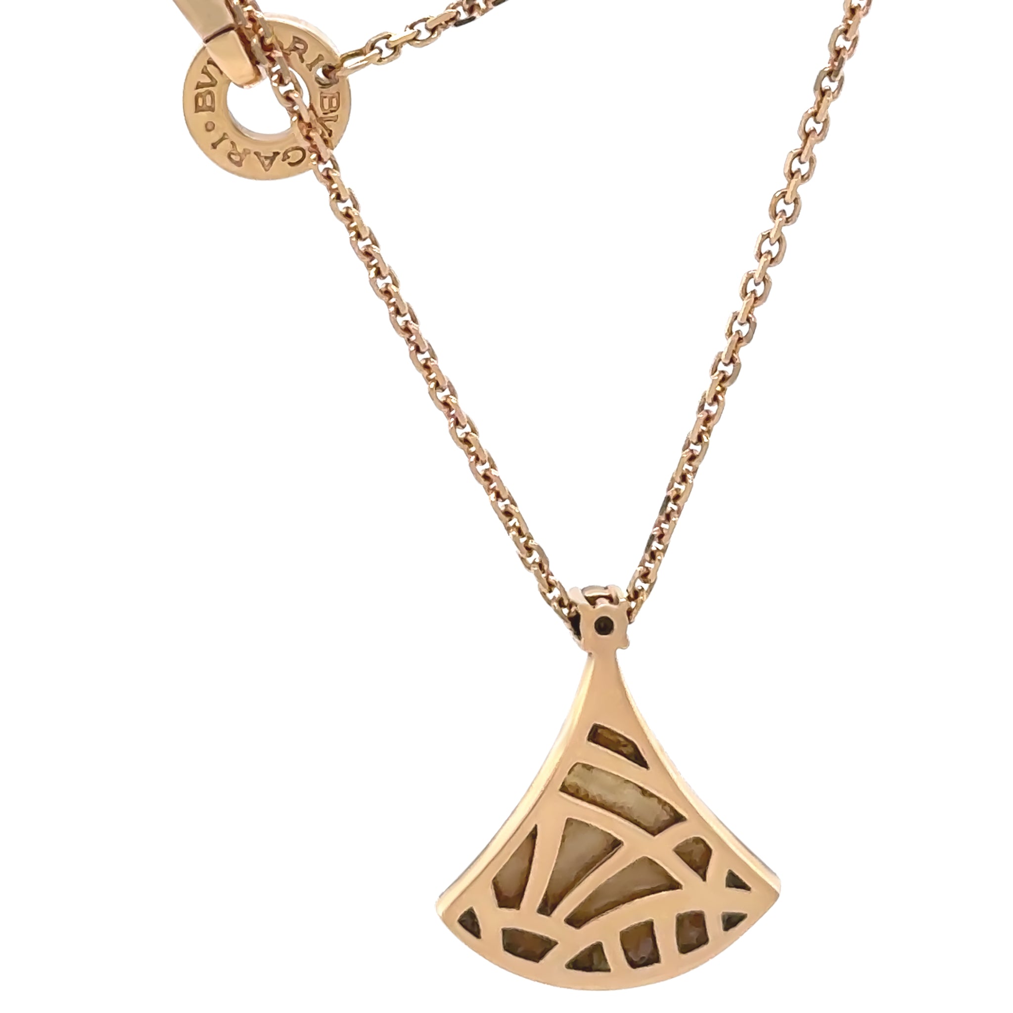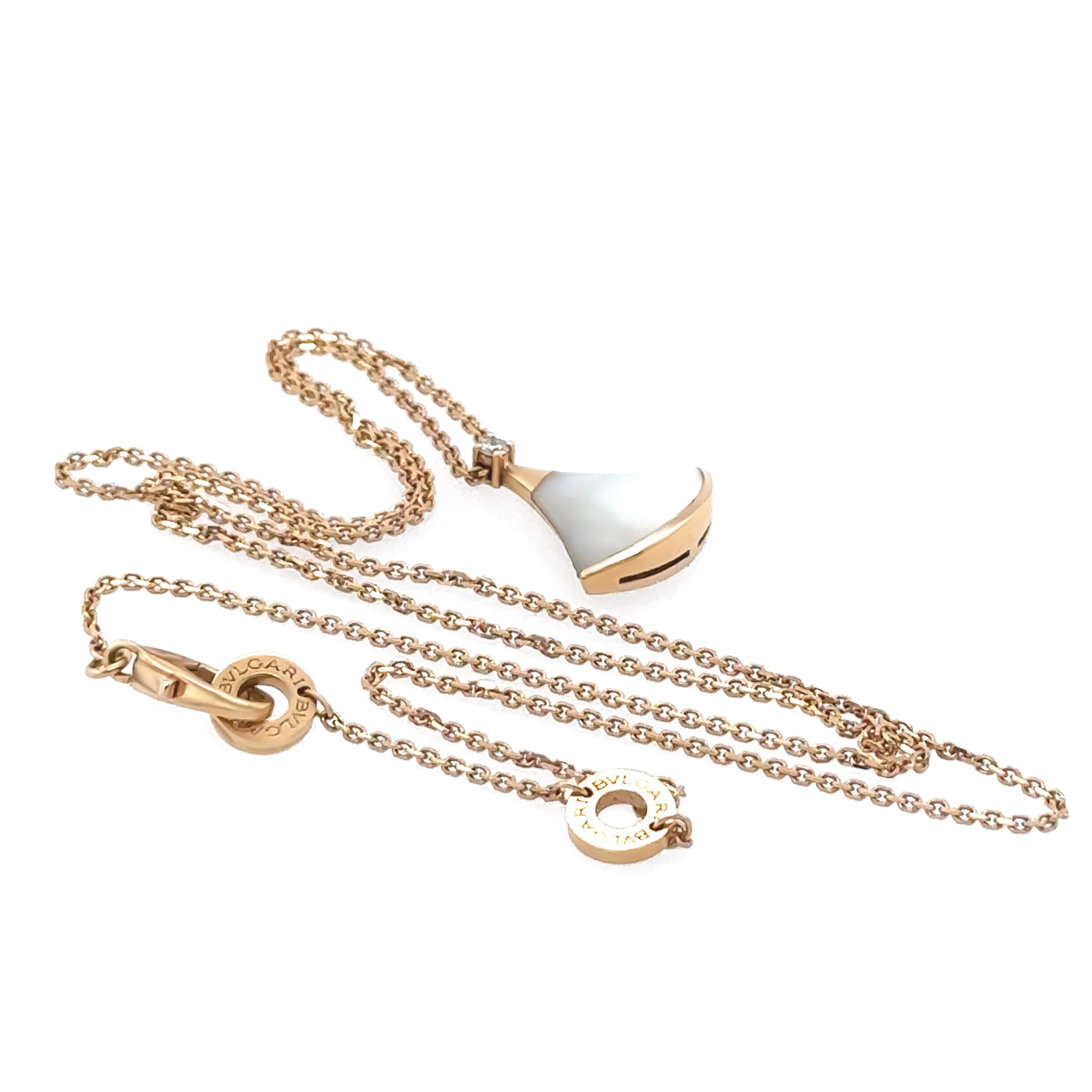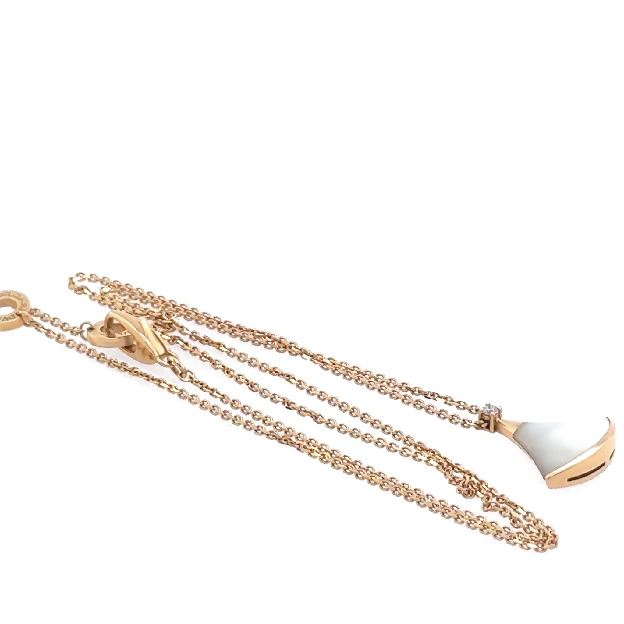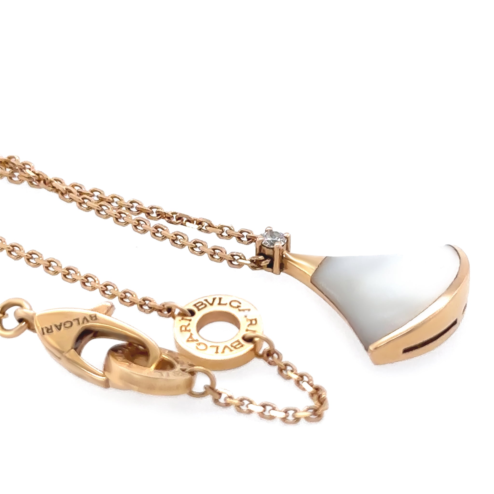 This elegant Bvlgari Divas’ Dream necklace is crafted in 18ct rose gold, featuring a delicate mother-of-pearl motif accented with 0.03ct of diamonds for subtle sparkle. Weighing 5.06 grams, this necklace embodies the brand’s signature blend of Italian luxury and timeless design, making it a refined addition to any jewellery collection.