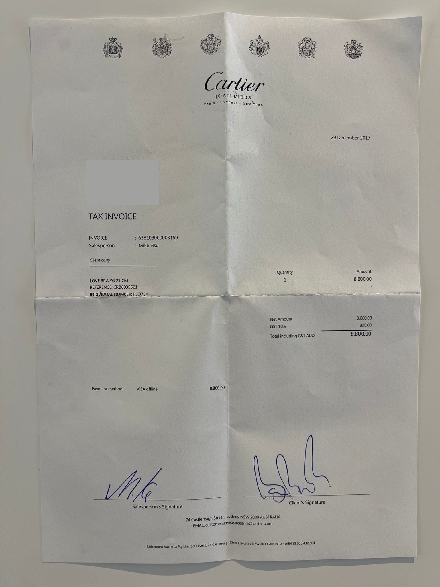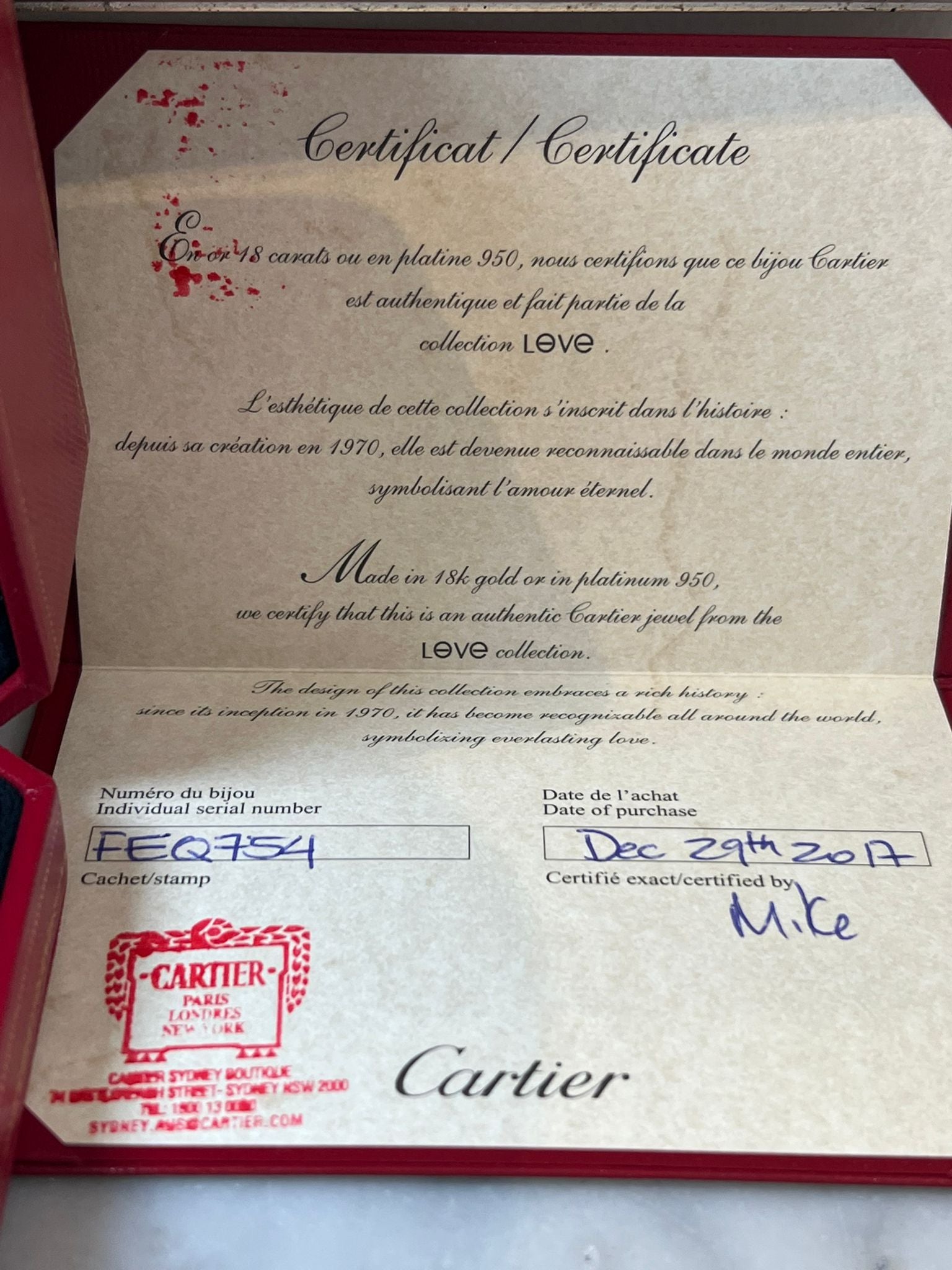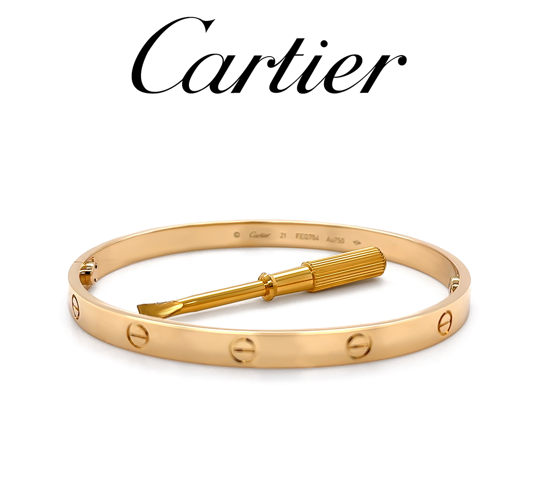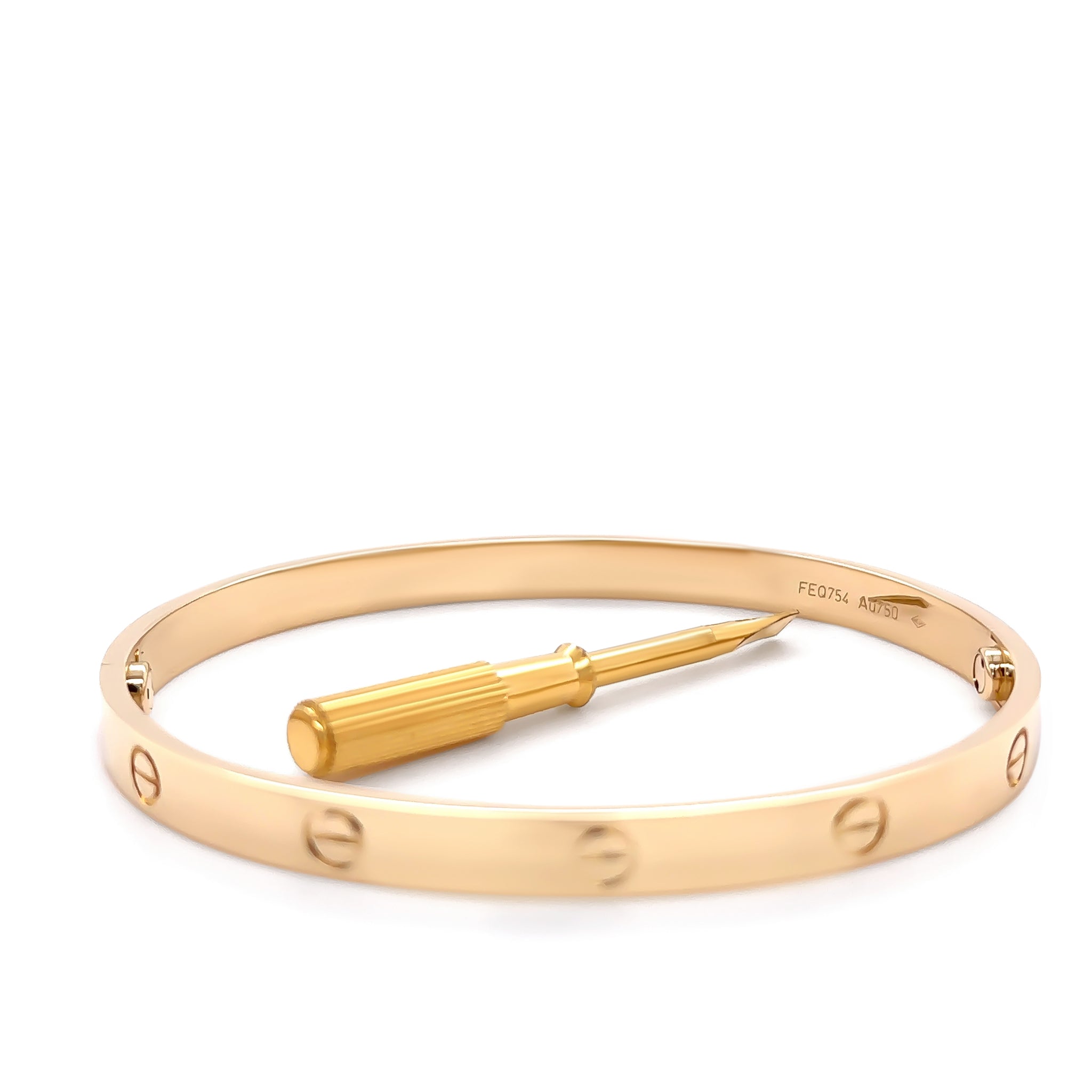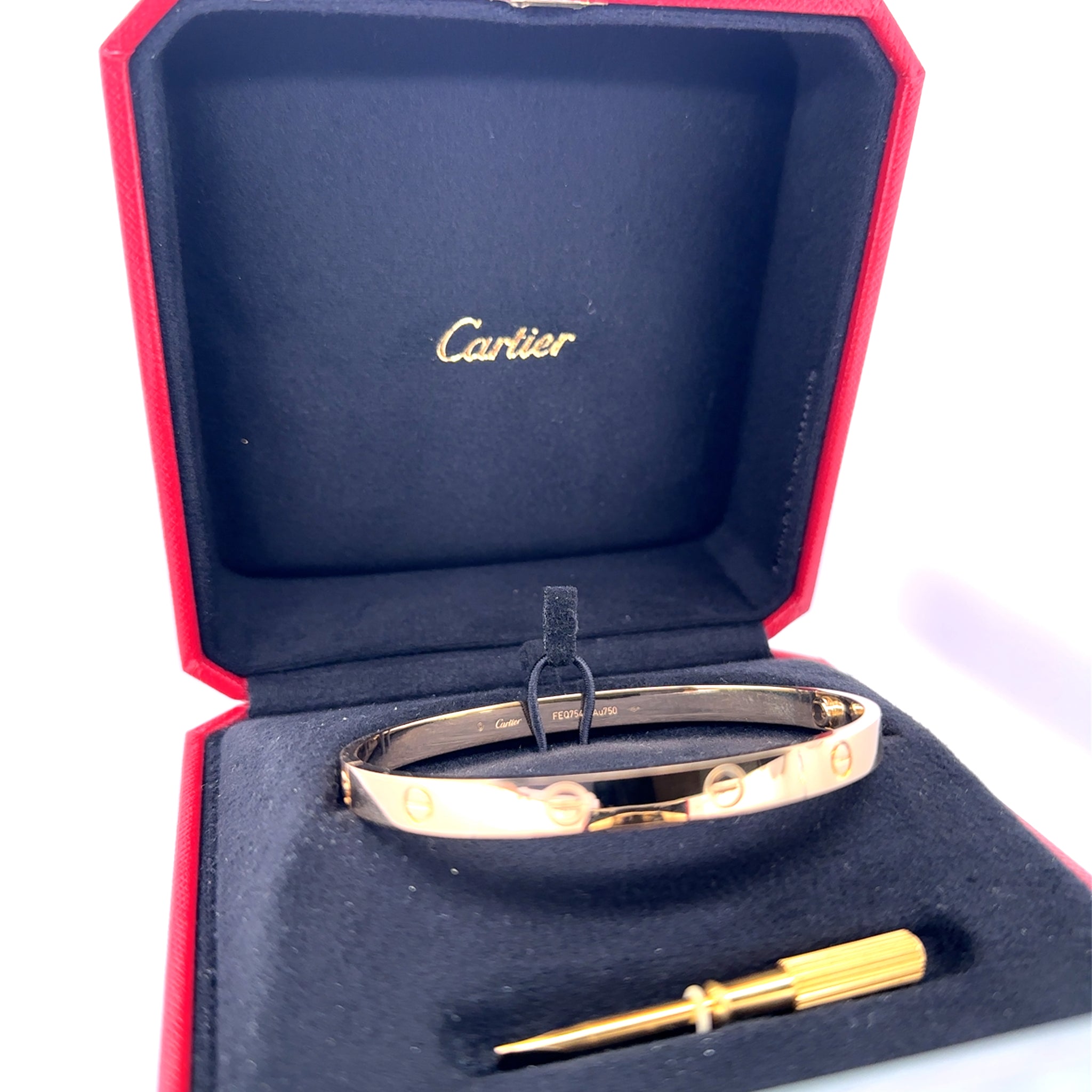 Accompanied by: This Cartier Love Bracelet is accompanied by the original Cartier certificate of authenticity (Serial Number FEQ754 dated 29/12/2017), original receipt dated 29/12/2017, and original Cartier box.