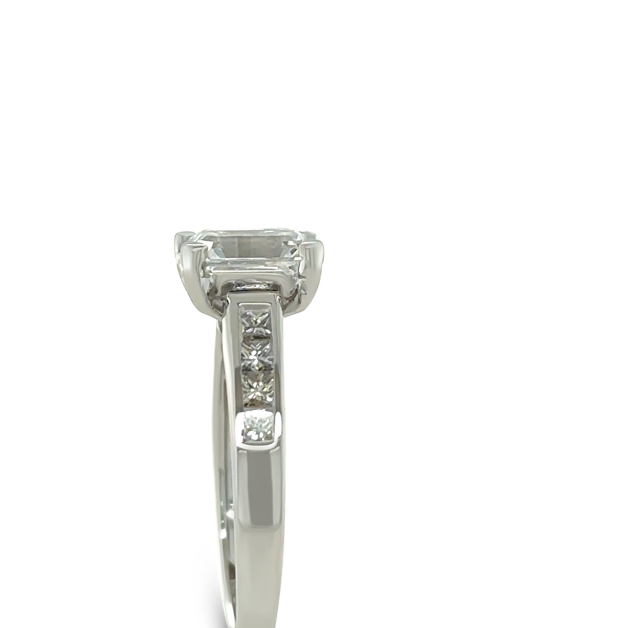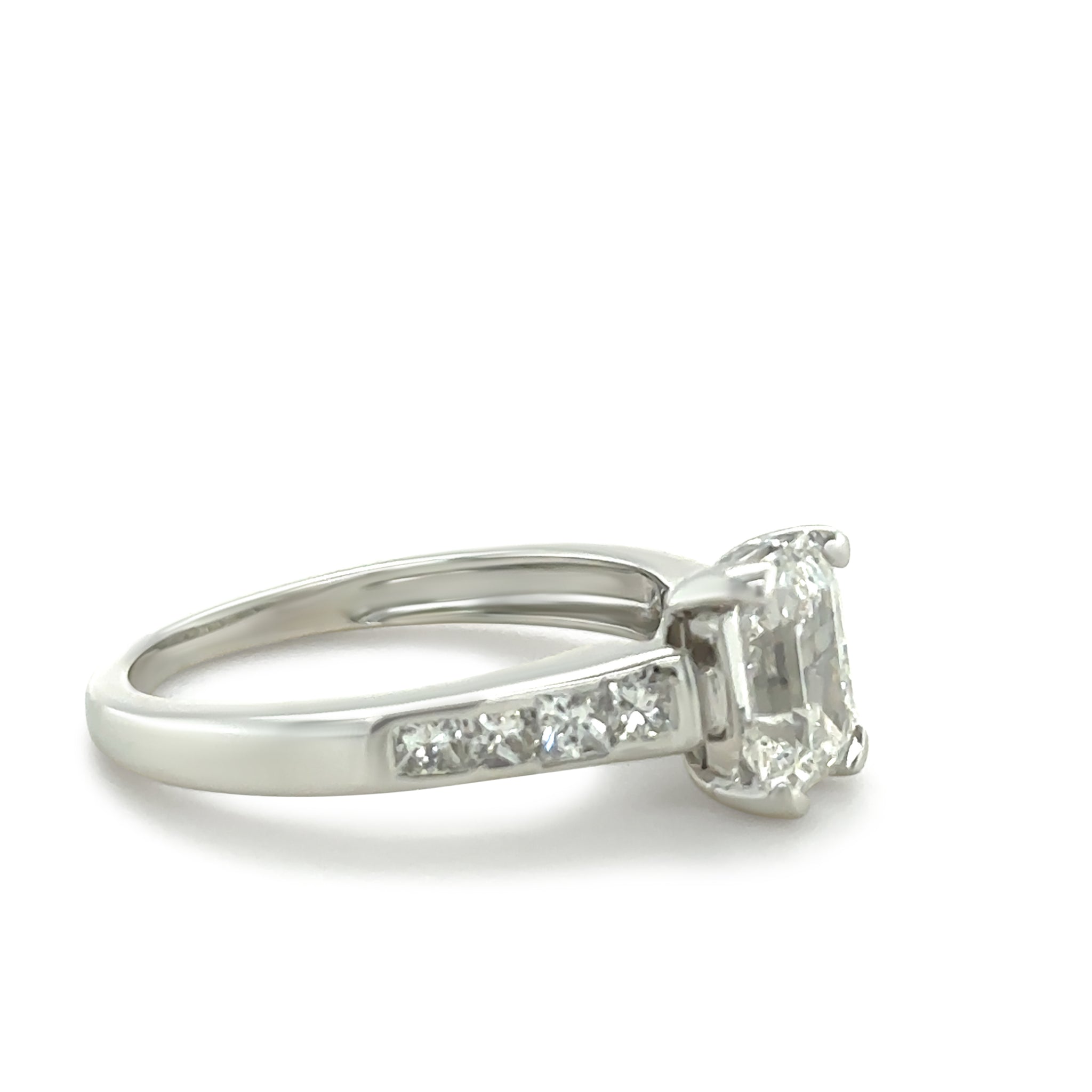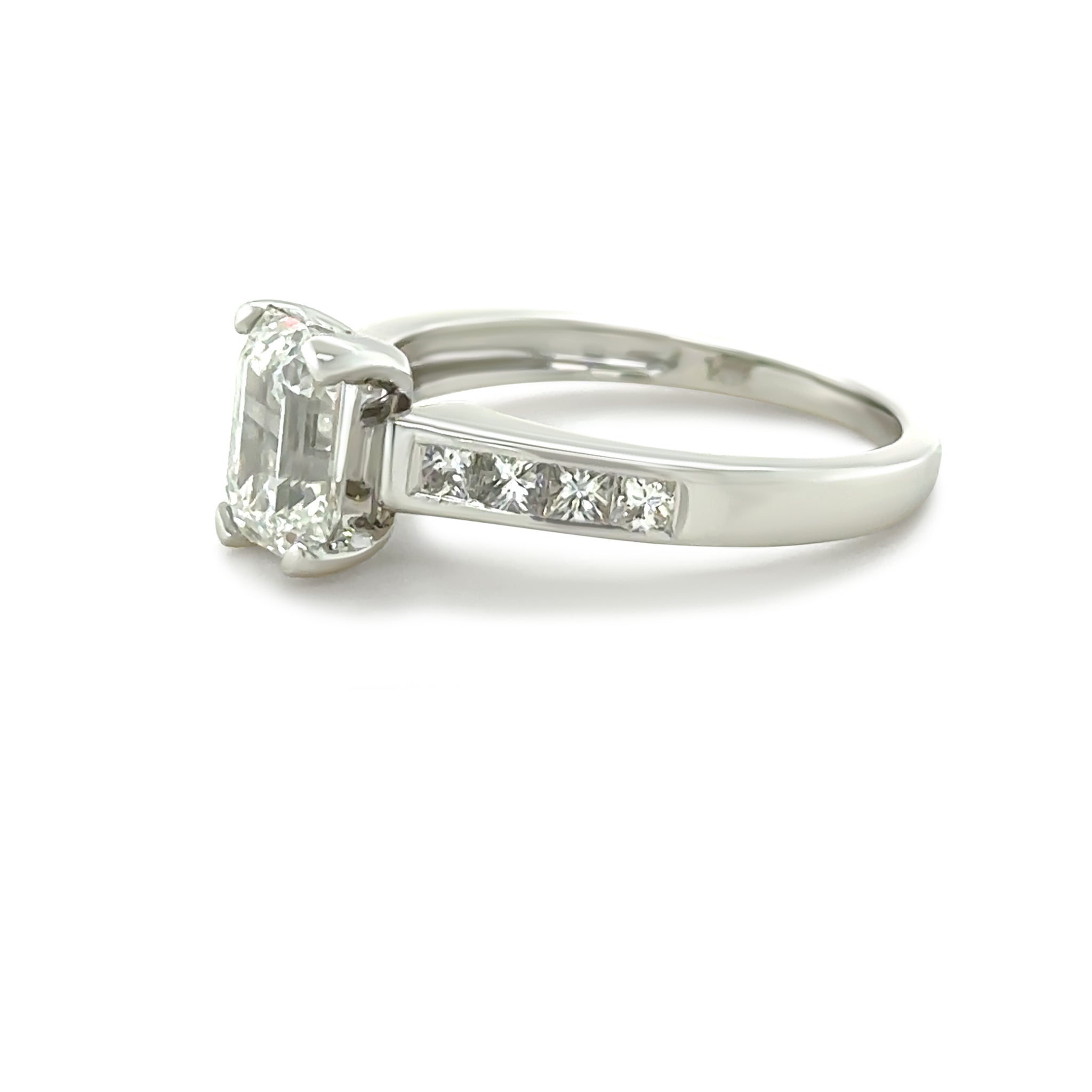 This exquisite engagement ring is crafted in 18ct white gold and platinum, stamped K18 Pt, and designed in a classic yet sophisticated style. The ring, size M, weighs 3.6 grams and is set with a stunning 1.44ct emerald step-cut diamond, graded F colour and VS2 clarity. Its clean lines and exceptional brilliance highlight the timeless beauty of the centre stone.