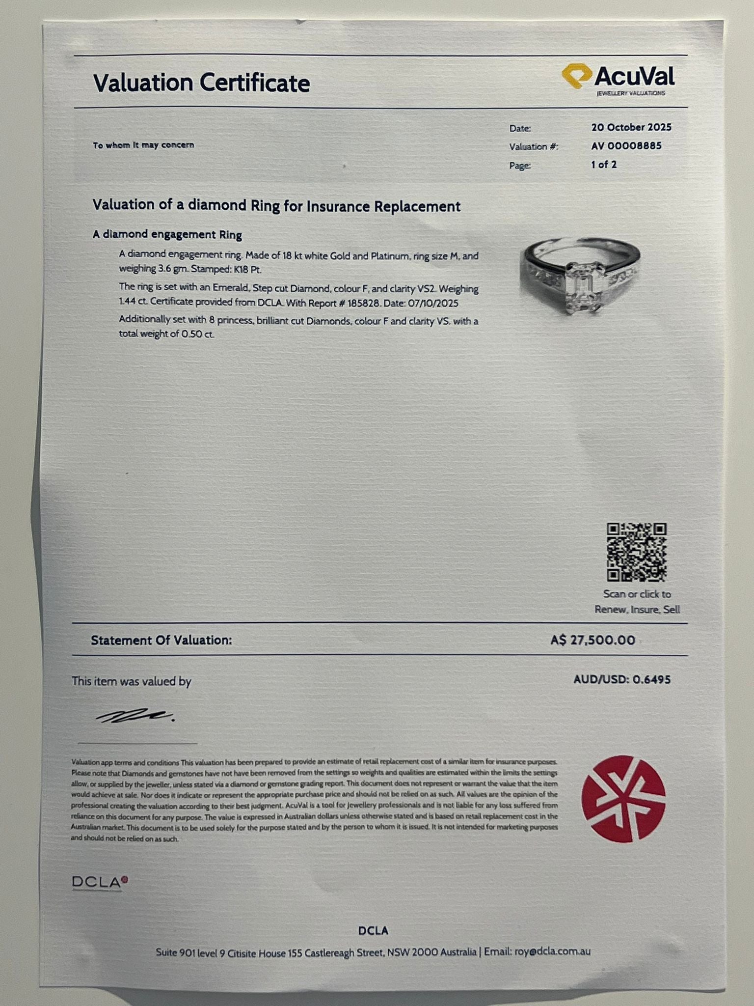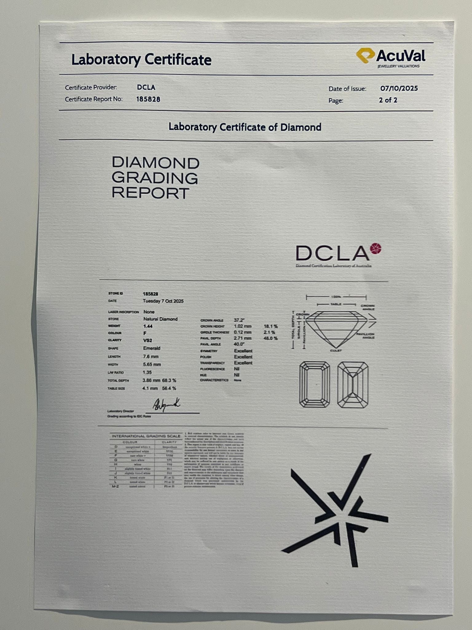 Accompanied by: This DCLA Diamond engagement ring is accompanied by DCLA Diamond Certificate (#185828, dated 7th October 2025) and AcuVal Valuation Certificate (#AV 00008885, dated 20th October 2025)