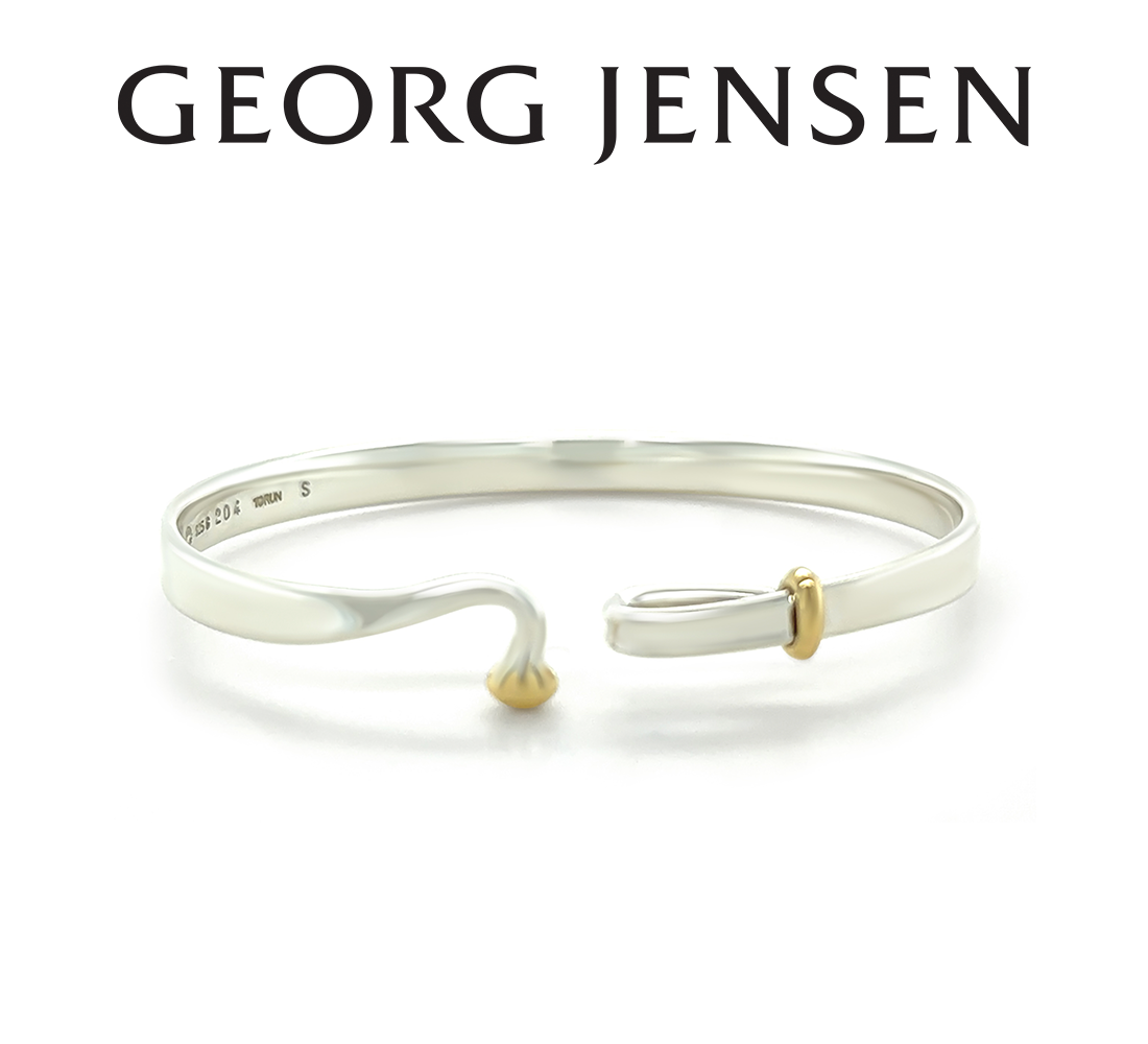 This elegant Georg Jensen Torun bracelet is crafted from sterling silver and accented with 18ct yellow gold, reflecting the timeless Scandinavian design aesthetic that defines the brand. The bracelet weighs 15 grams and is presented in size S, offering a sleek and modern expression of understated luxury.