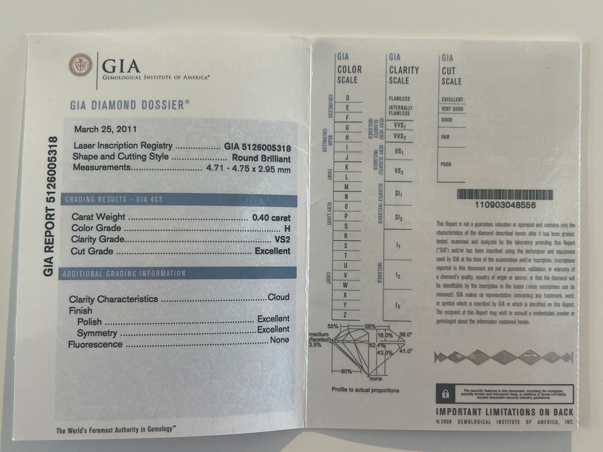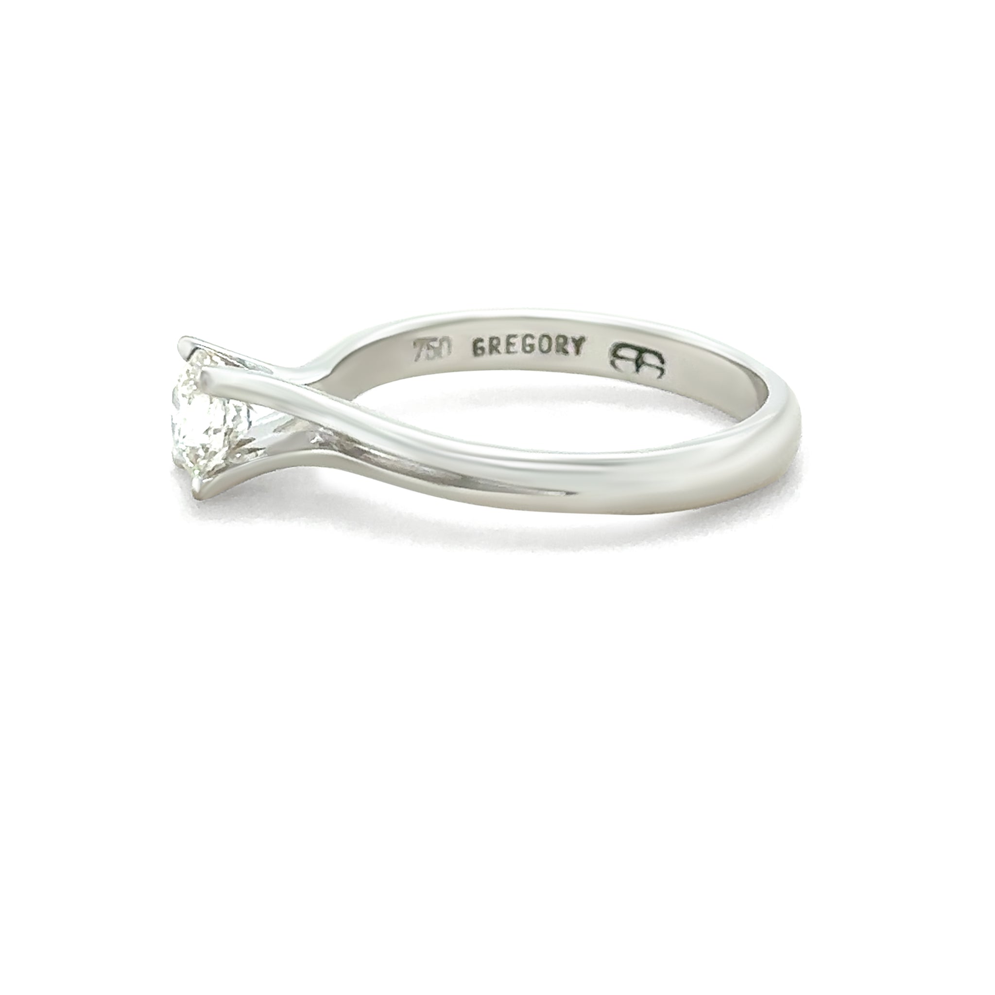 This elegant diamond ring is crafted in 18ct white gold, showcasing a 0.40ct round brilliant-cut diamond (H colour, VS2 clarity, excellent cut, 4.71–4.75 x 2.95mm) as the centrepiece. The ring combines timeless design with superior craftsmanship, weighing 2.73 grams and sized I, making it a versatile and sophisticated addition to any jewellery collection.