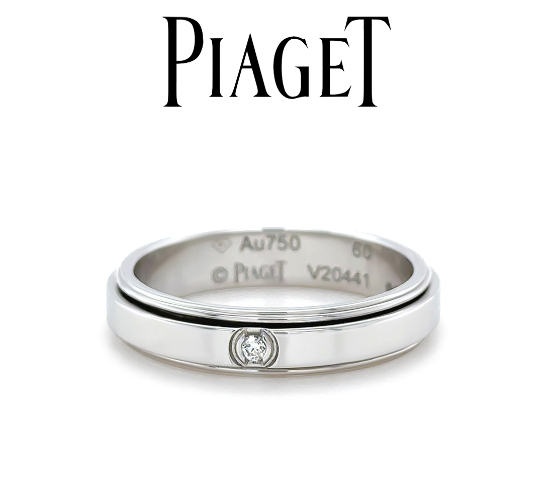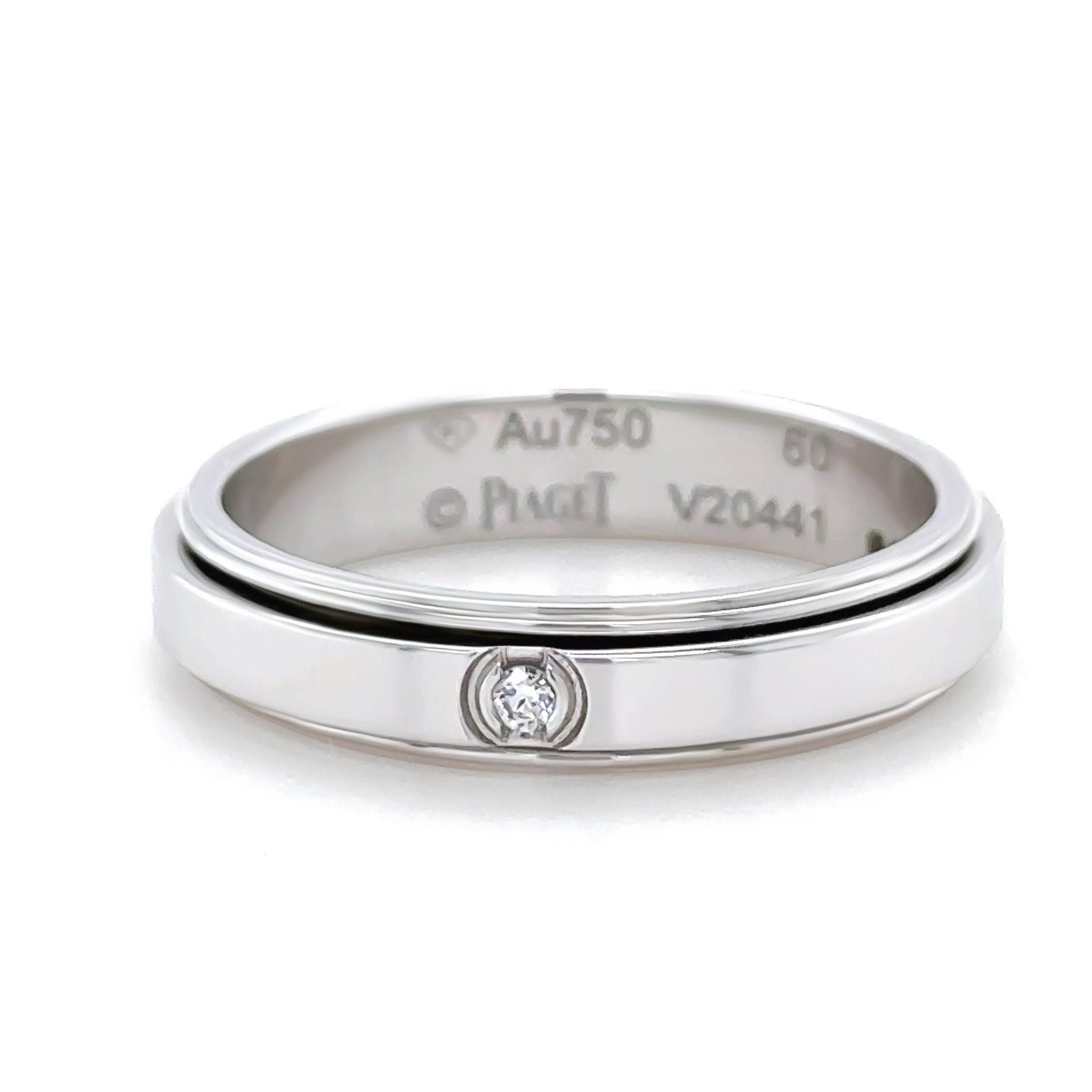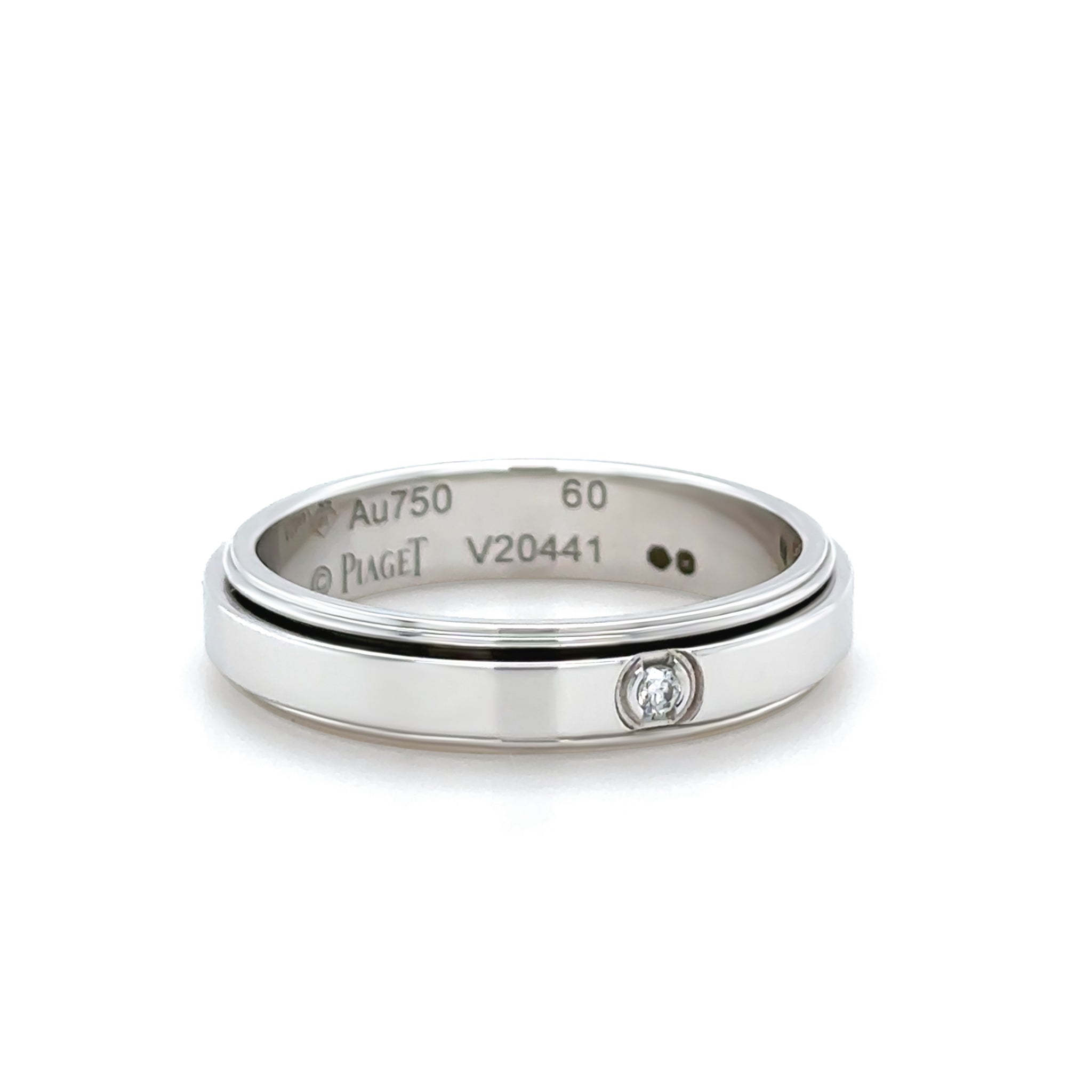 This iconic Piaget Possession spinning ring is crafted in luxurious 18ct white gold and features the signature rotating band design synonymous with the collection. Set with a single round brilliant cut diamond totalling approximately 0.02 carats, the ring offers a refined touch of sparkle while maintaining a clean, contemporary aesthetic.