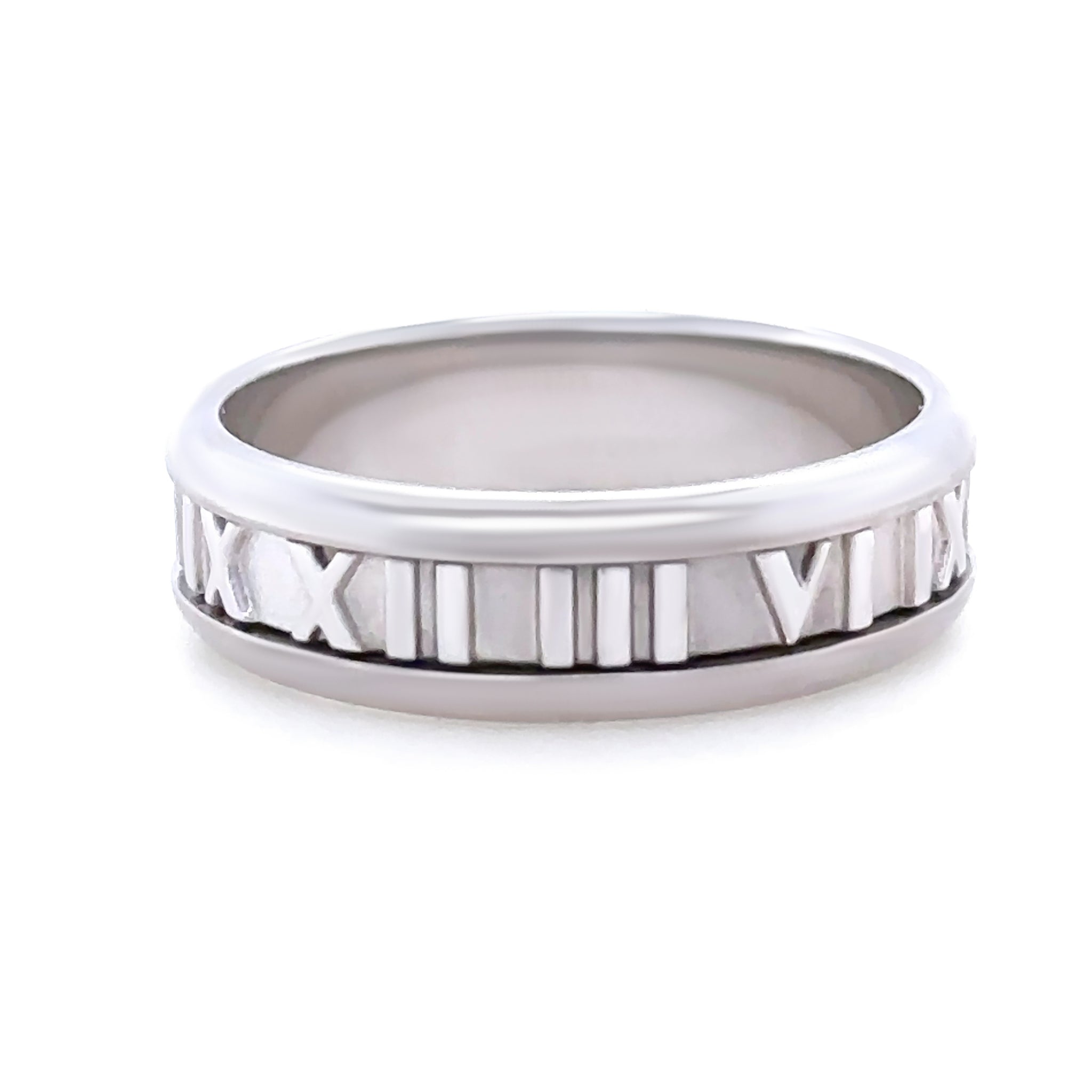 A rare and highly sought-after piece from Tiffany & Co., this Atlas ring is crafted in solid 18ct white gold, showcasing the brand’s iconic Roman numeral design. The band measures 7mm wide and weighs 11 grams, combining bold presence with elegant wearability. Its rarity makes it a standout addition for collectors and connoisseurs of fine jewellery.
