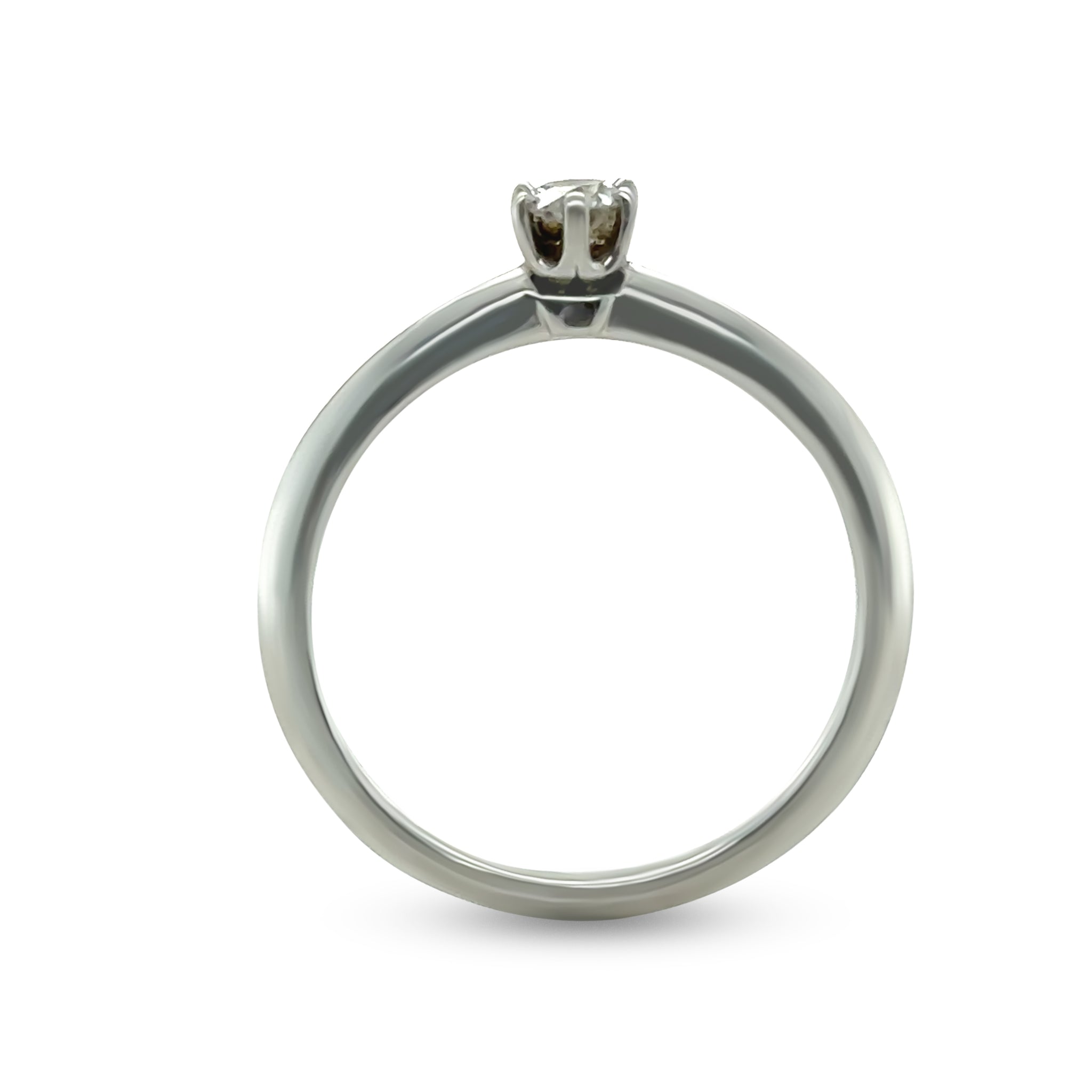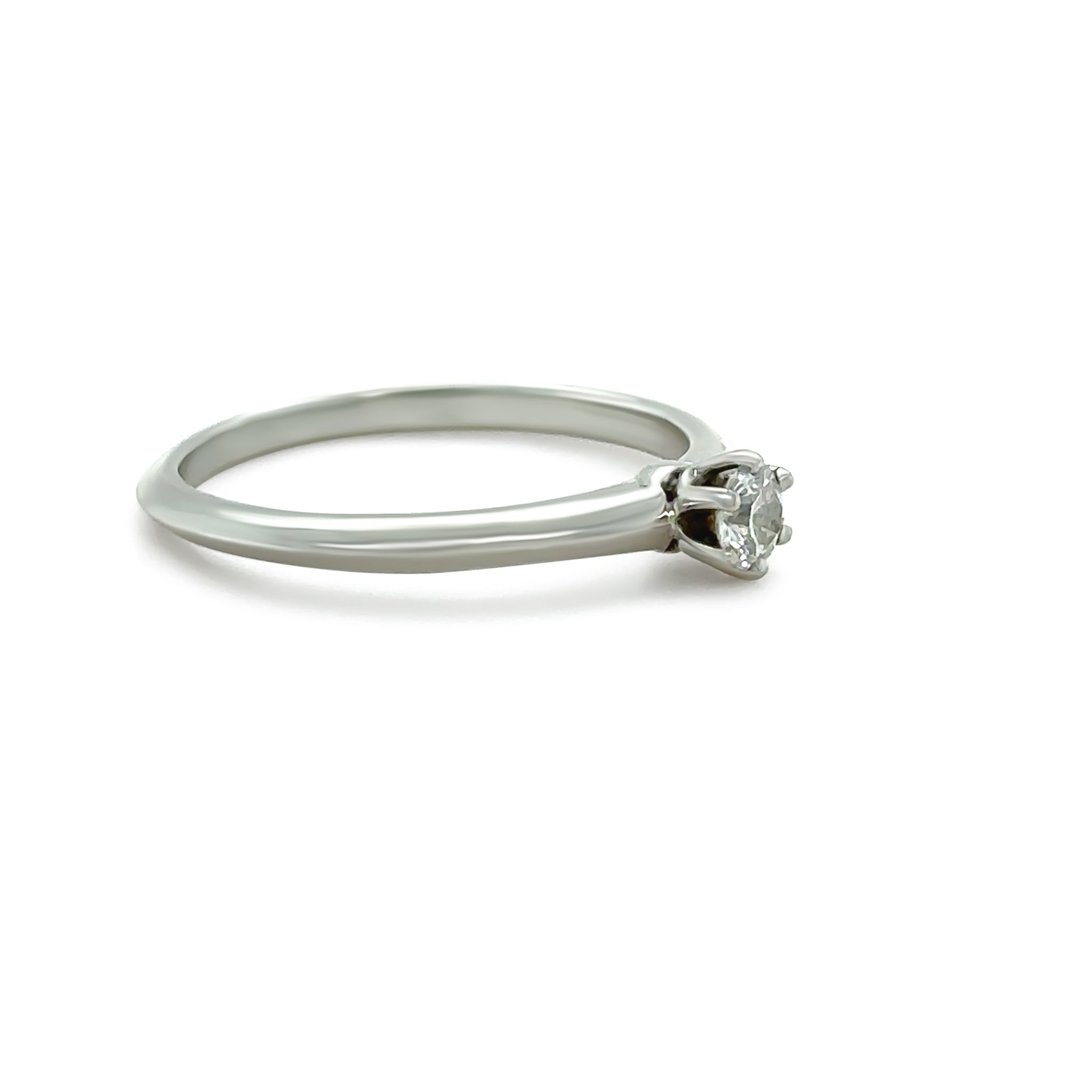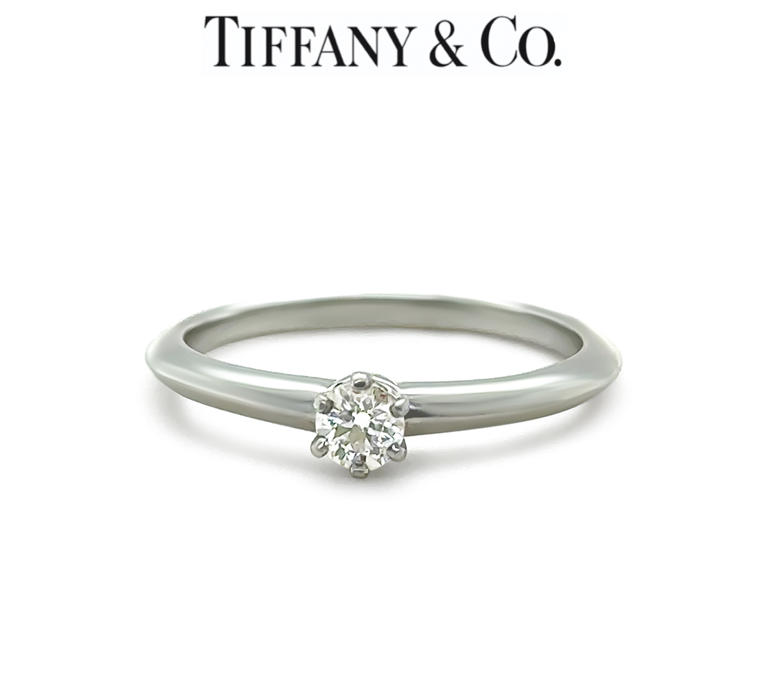 This elegant Tiffany & Co. solitaire engagement ring is crafted in platinum, showcasing a timeless and refined design centred on a beautifully proportioned round brilliant-cut diamond. The diamond weighs 0.18 carats, graded D colour and VVS2 clarity, offering exceptional brilliance and purity in a classic Tiffany setting.