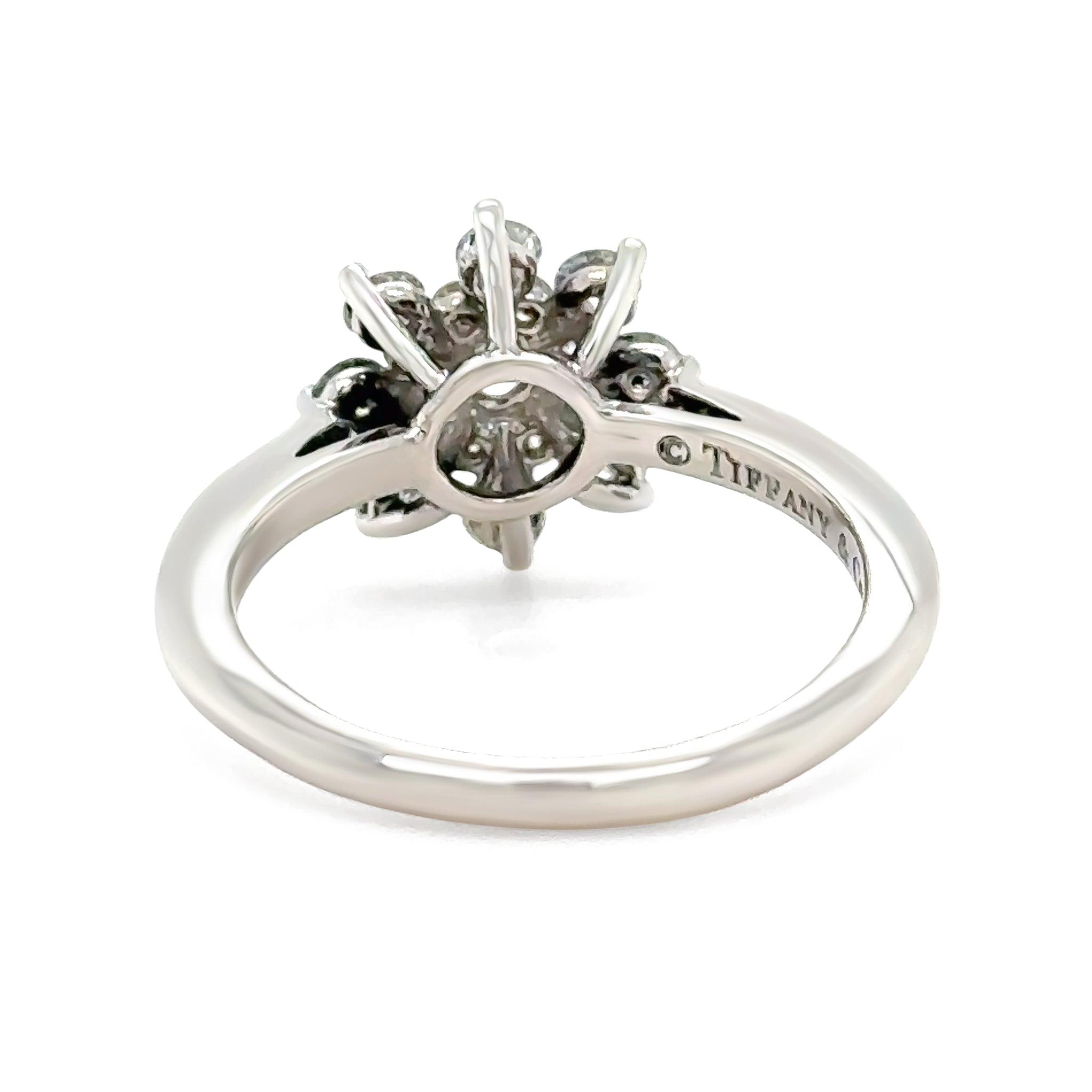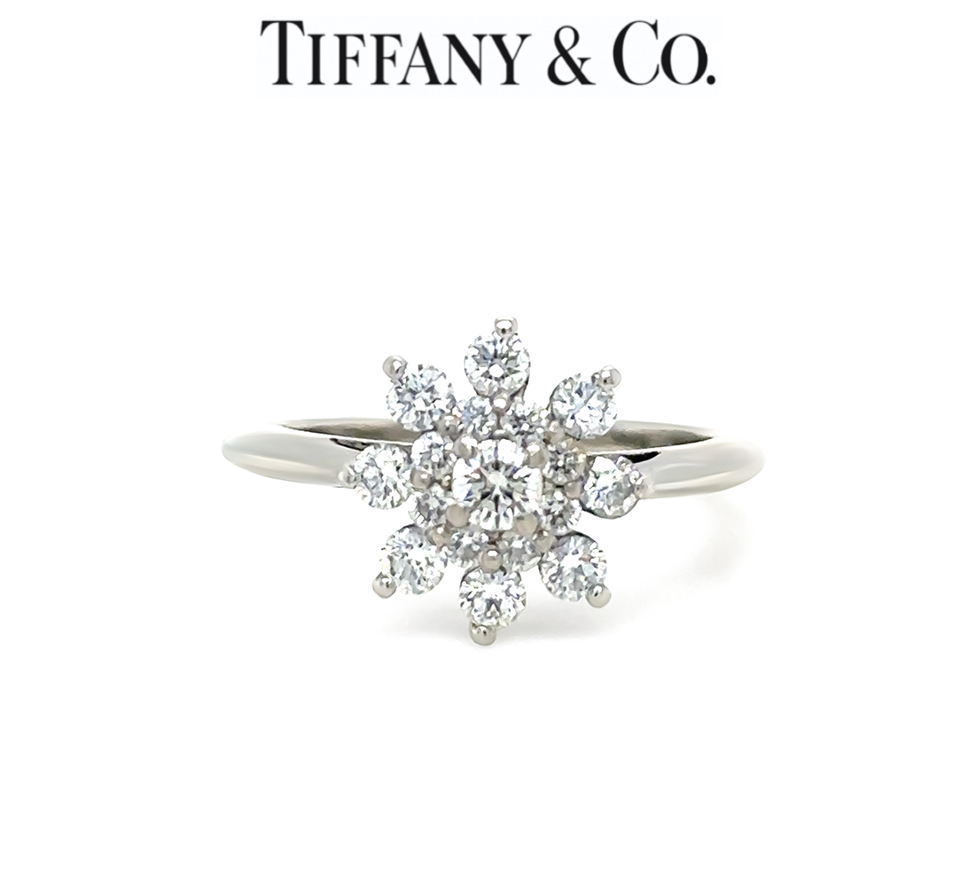 An elegant and authentic Tiffany & Co. diamond flower ring crafted in platinum (Pt950), showcasing refined craftsmanship and timeless design. The ring features a delicate snowflake-style floral motif, set with round brilliant-cut diamonds in classic prong settings, creating a radiant and balanced sparkle across the top.