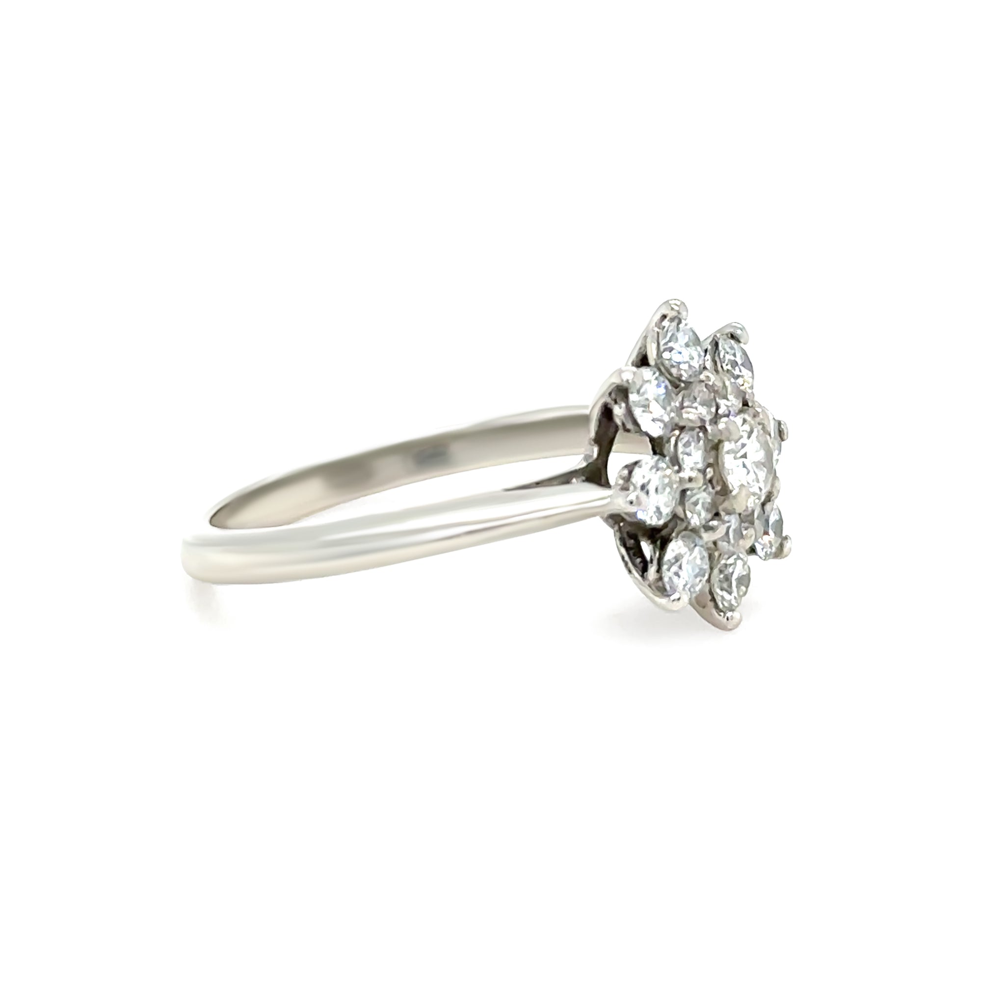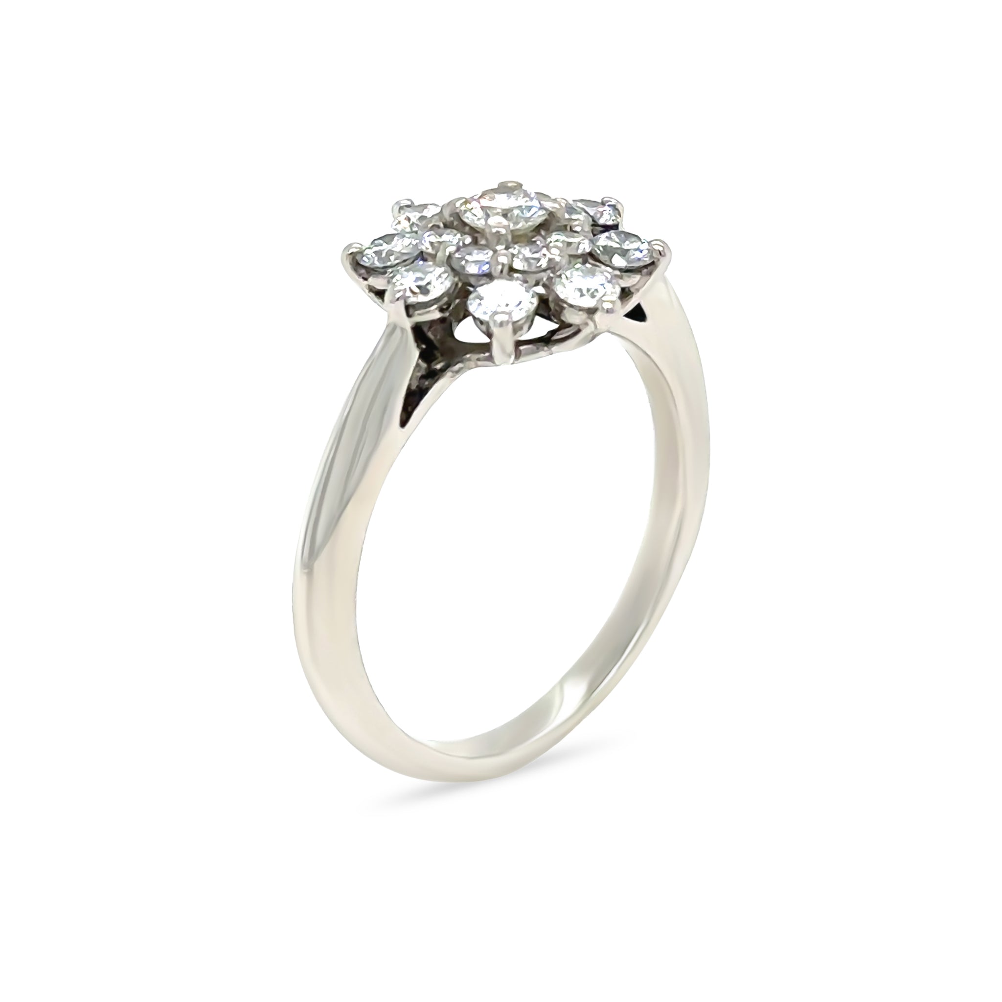 Designed with a low bridge and knife-edge shank that gently tapers into the band, this ring offers both comfort and architectural elegance. The diamonds total approximately 0.60 carats, graded G colour and VS clarity, delivering excellent brilliance and clarity. The floral top measures approximately 10.5mm in diameter and 6mm in height, giving the ring a graceful yet eye-catching presence.