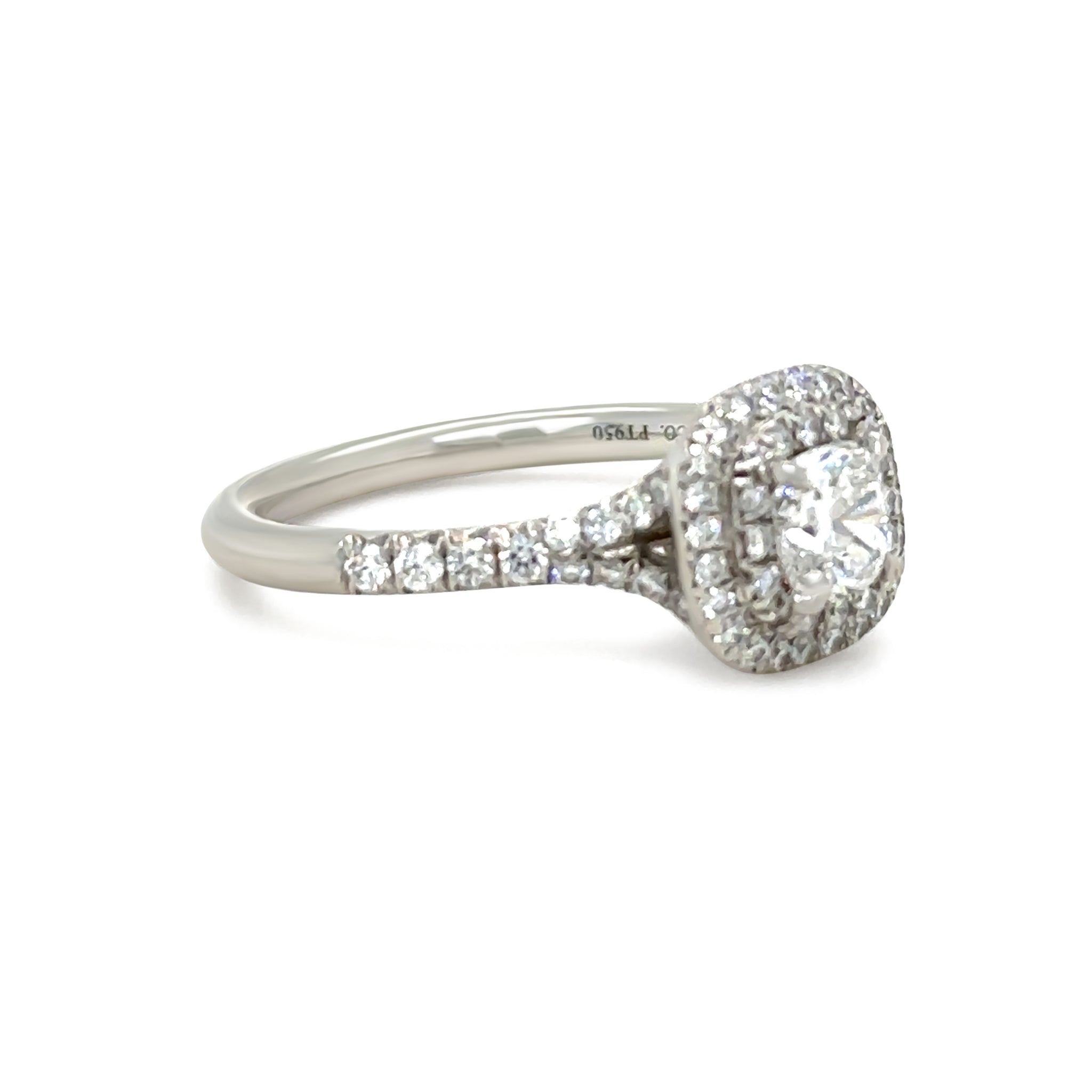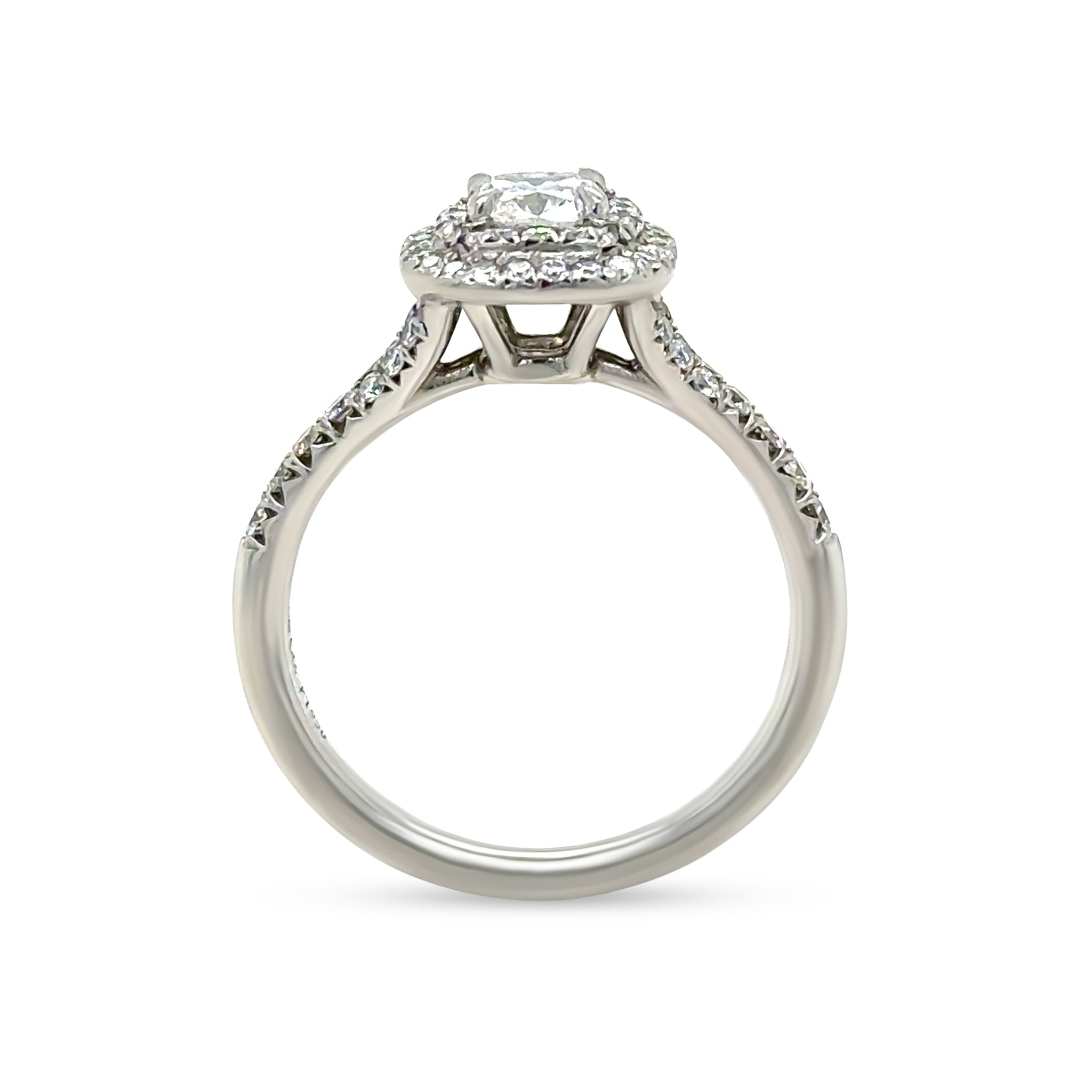 An elegant Tiffany & Co. Soleste diamond ring crafted in platinum (PT950), showcasing the signature double halo design.