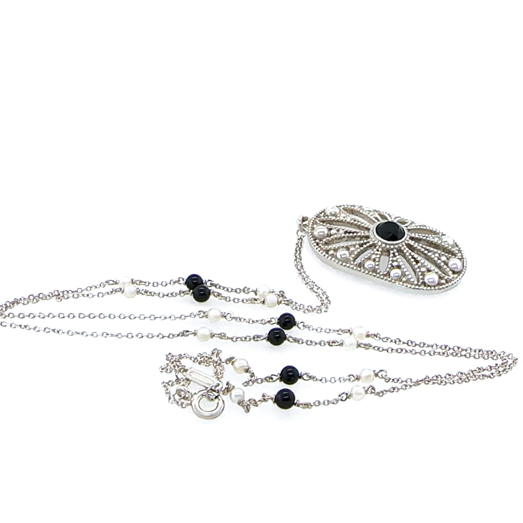 This elegant Tiffany & Co. Daisy Ziegfeld set is crafted in sterling silver and comprises a coordinating necklace and pair of earrings, each featuring lustrous cultured pearls accented by striking black onyx in a refined floral motif. The necklace measures approximately 60cm in length and has a weight of 9.42 grams, offering a graceful drape and timeless sophistication.